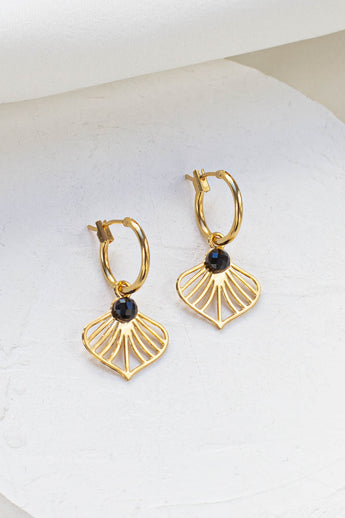 Un élément botanique délicat orné de pierres naturelles, suspendu à une paire de créoles, pour créer l'une de nos pièces préférées de cette collection.
