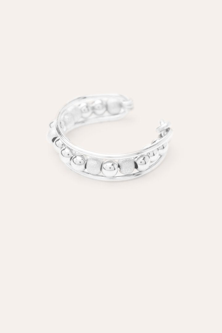 Ce bijou monochrome et scintillant argent, se compose de trois anneaux en fil, dont l'anneau central est orné de perles lisses et brillantes.
