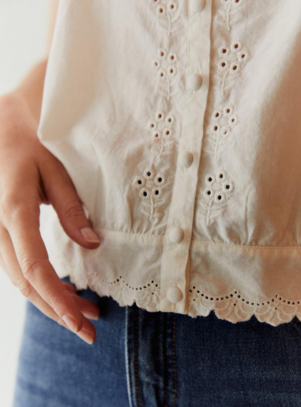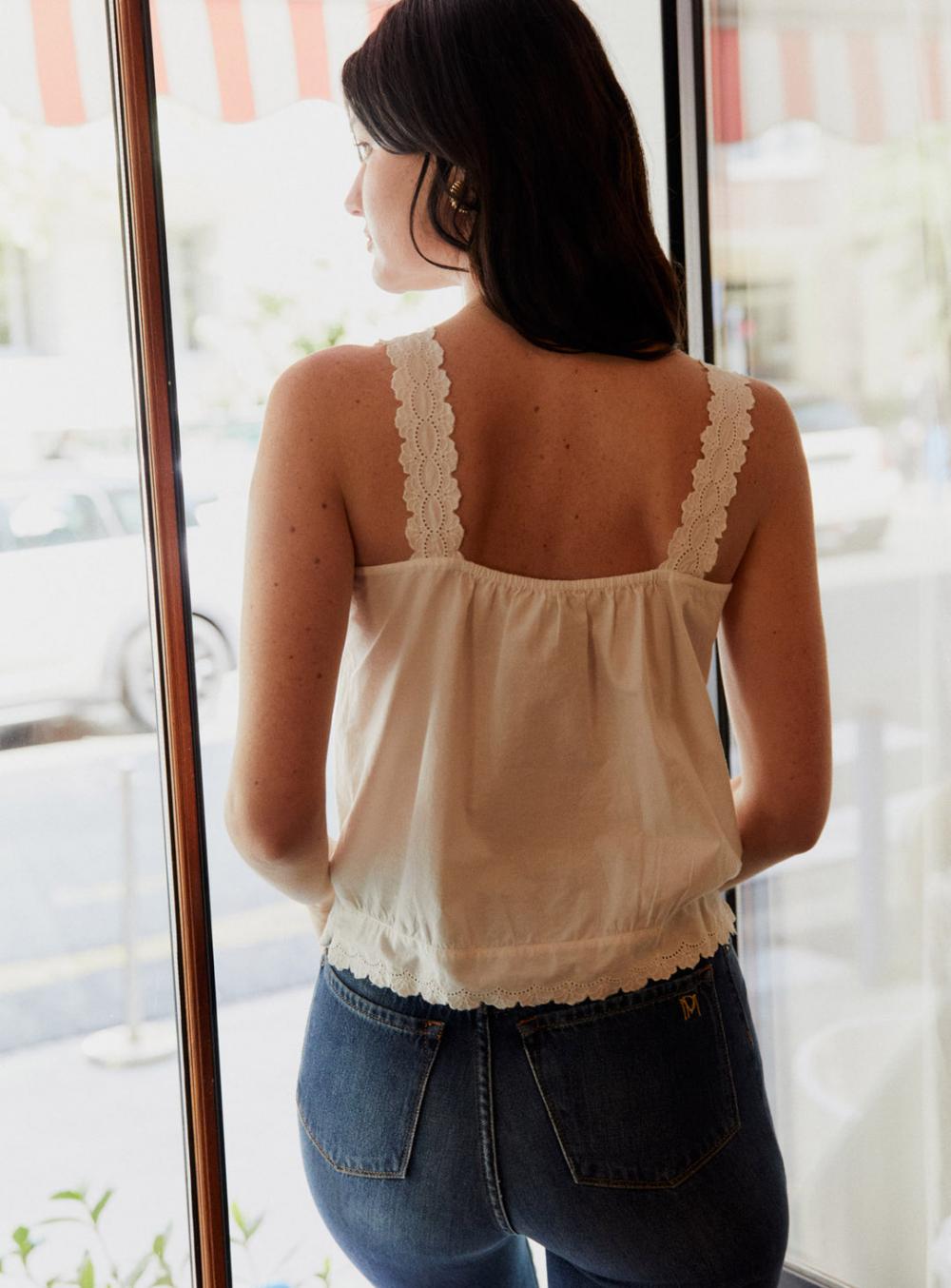 Top à bretelles en coton. Matière très légère. Broderie anglaise sur toute la longueur des bretelles ainsi que sur le devant et le bas du top. Boutonné sur le devant.