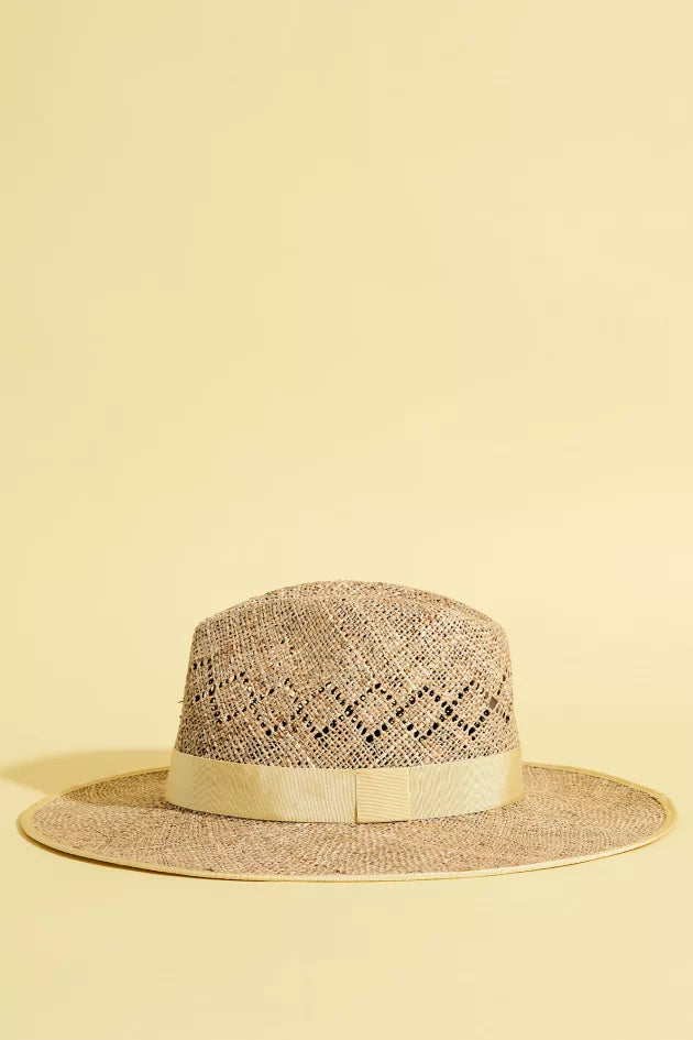 - Chapeau à bords larges ajouré orné d'un galon et d'un biais en gros grain bleu