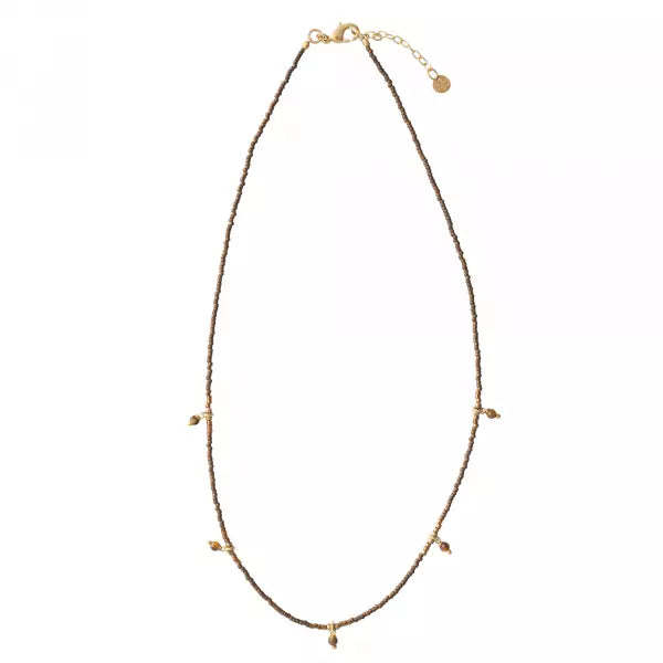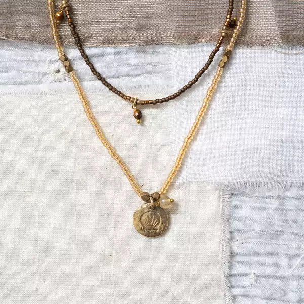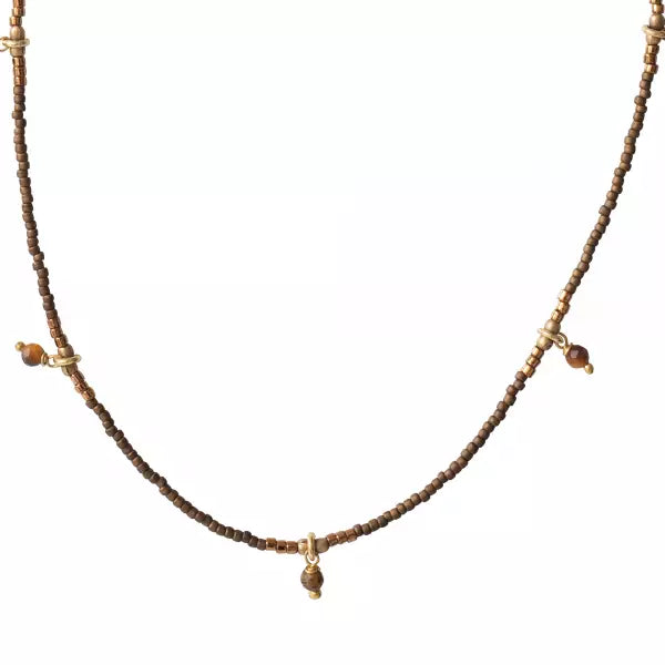 Ce collier est composé de perles de verre colorées, de perles de laiton et de petits pierres semi- précieuses.