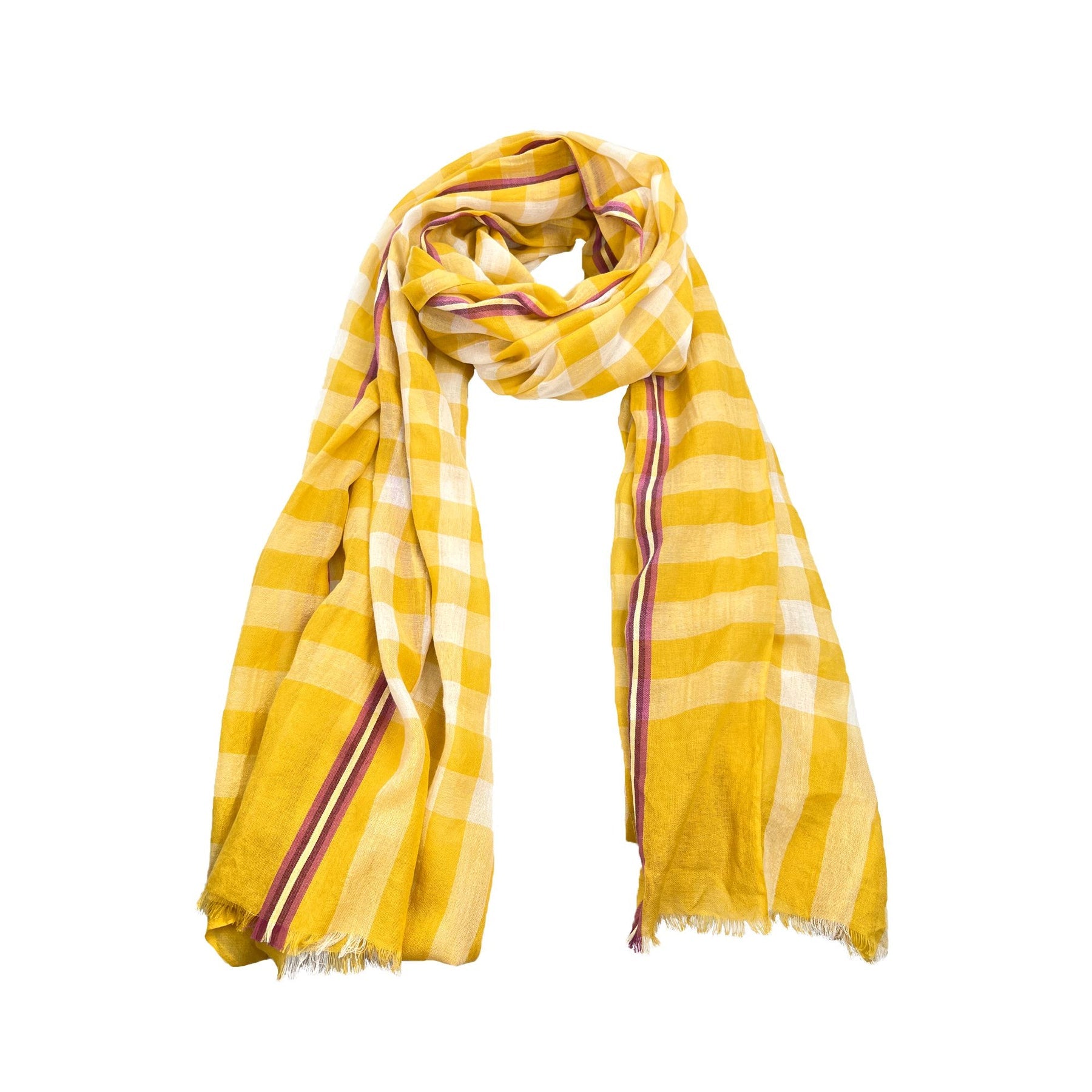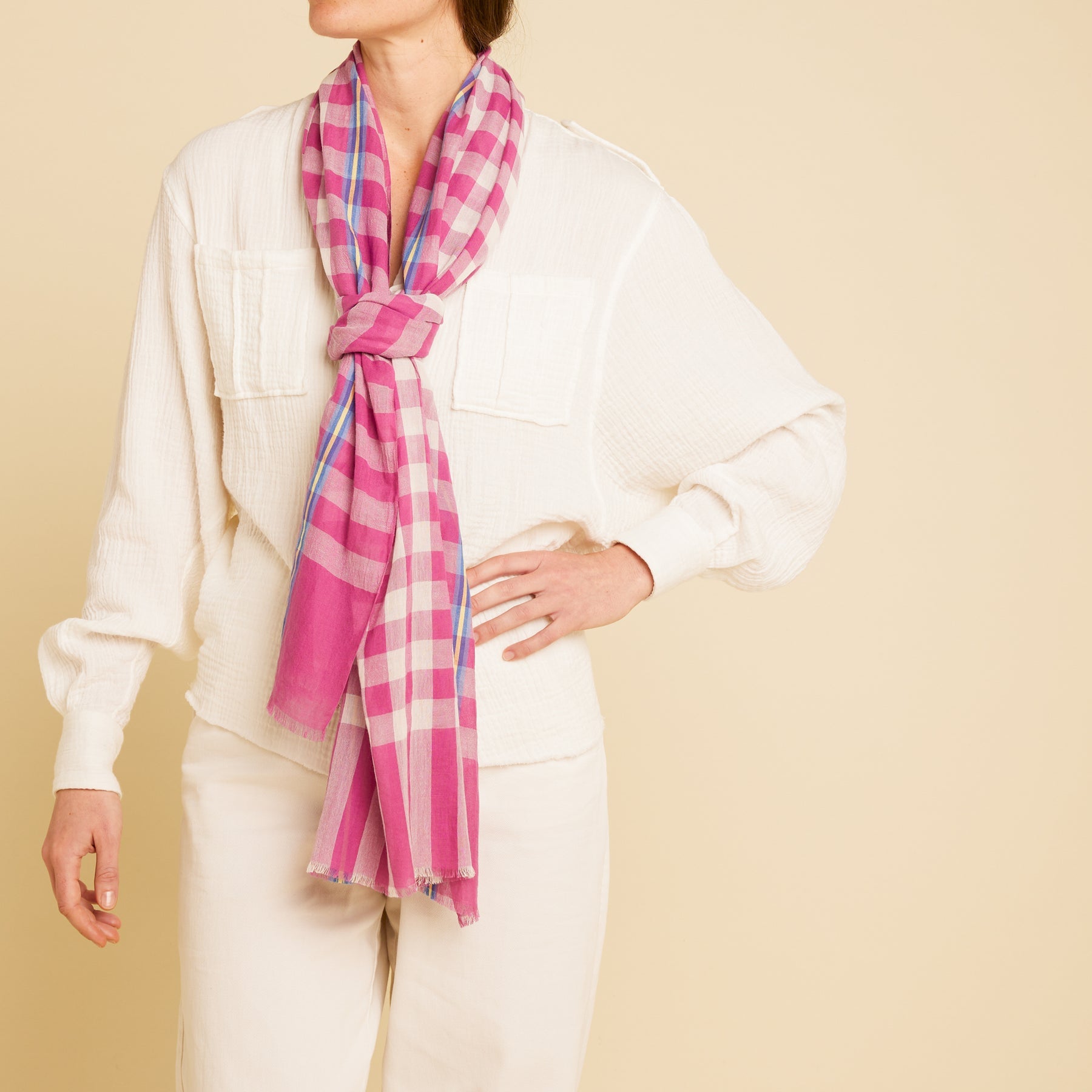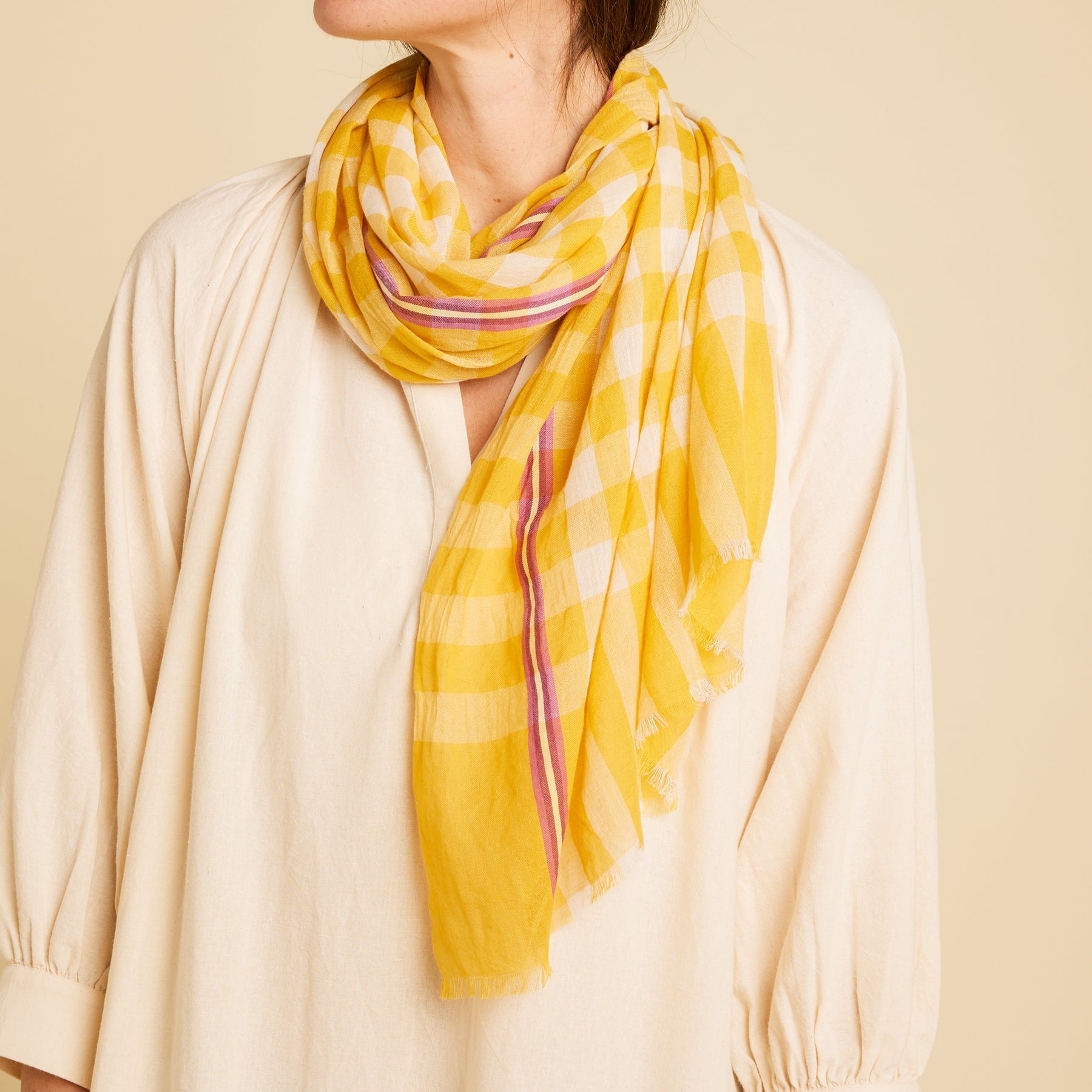 Écharpe à carreaux en coton. Imprimé exclusif. Finition ourlet frangé.