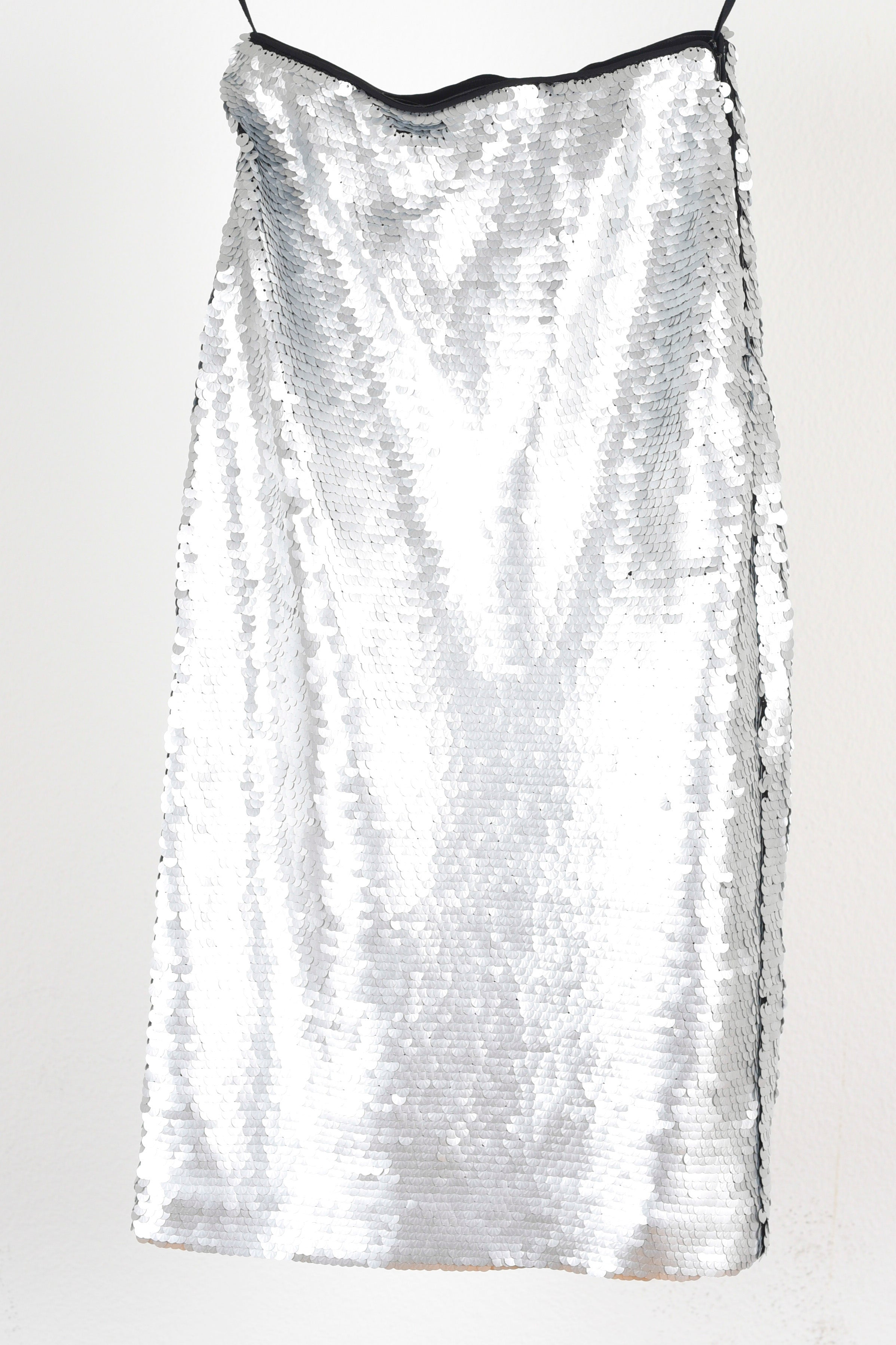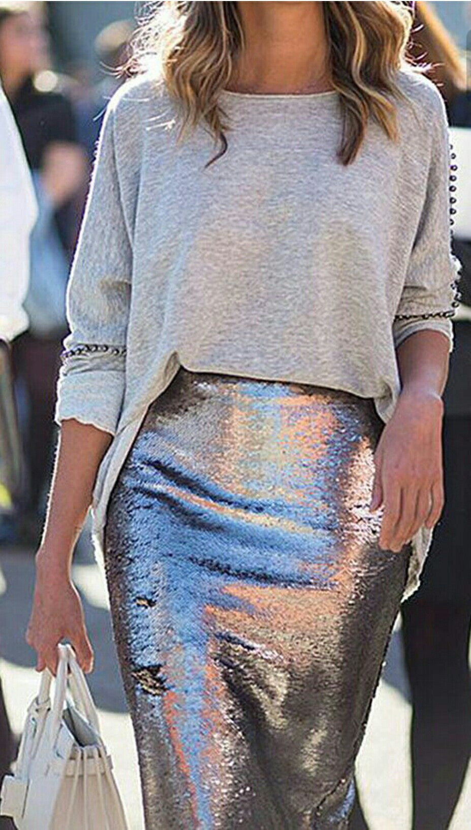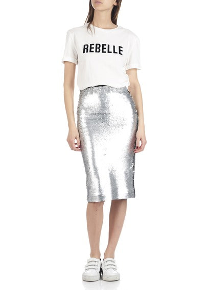 Jupe midi à sequins taille haute forme tube entièrement recouverte de sequins, taille élastiquée, zip invisible sur le côté.