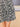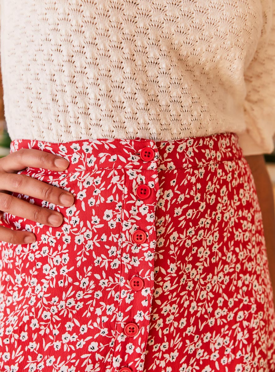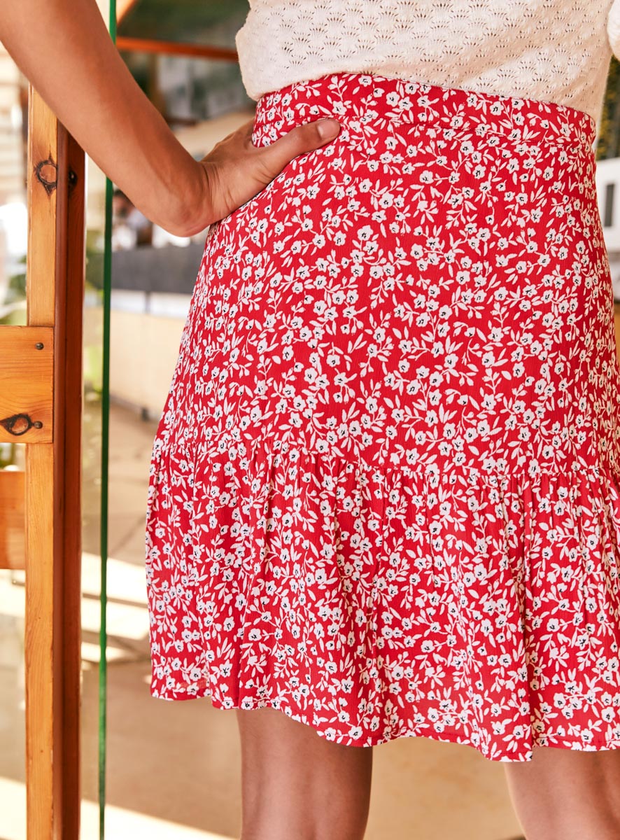 Jupe courte à motifs fleuris. Boutons noirs au centre. A volants en bas.