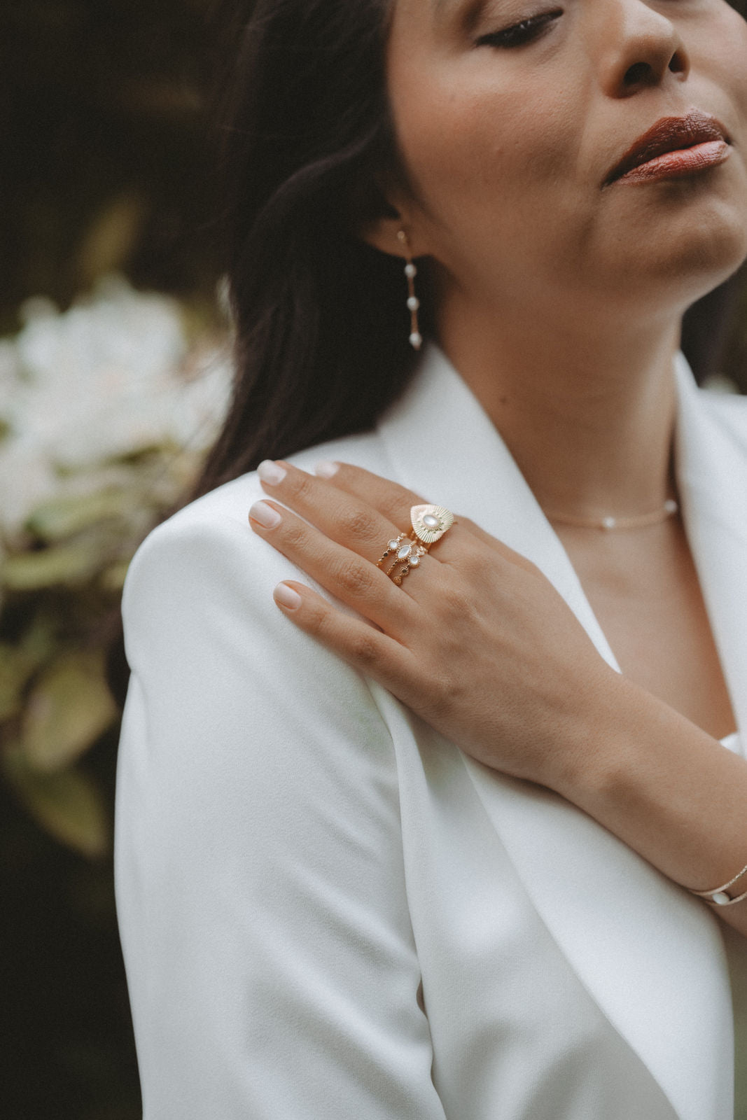 Sur la 3ème photo, le mannequin porte également la bague Camelia et les boucles d'oreilles Calla.