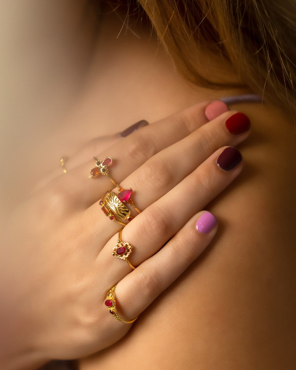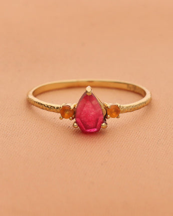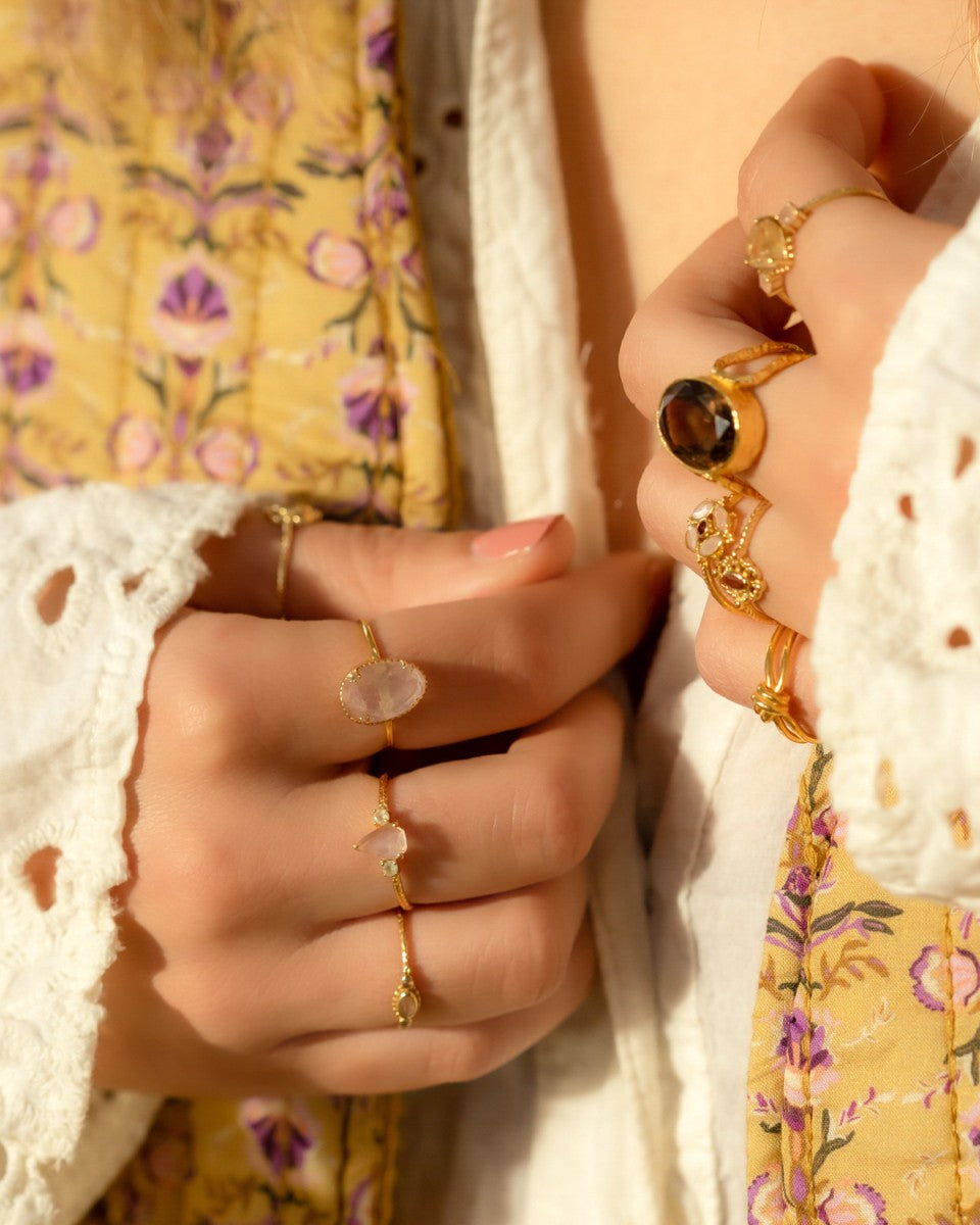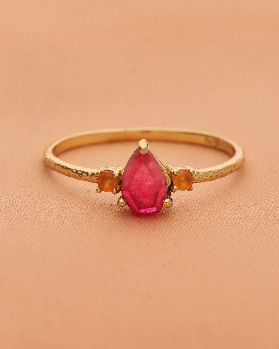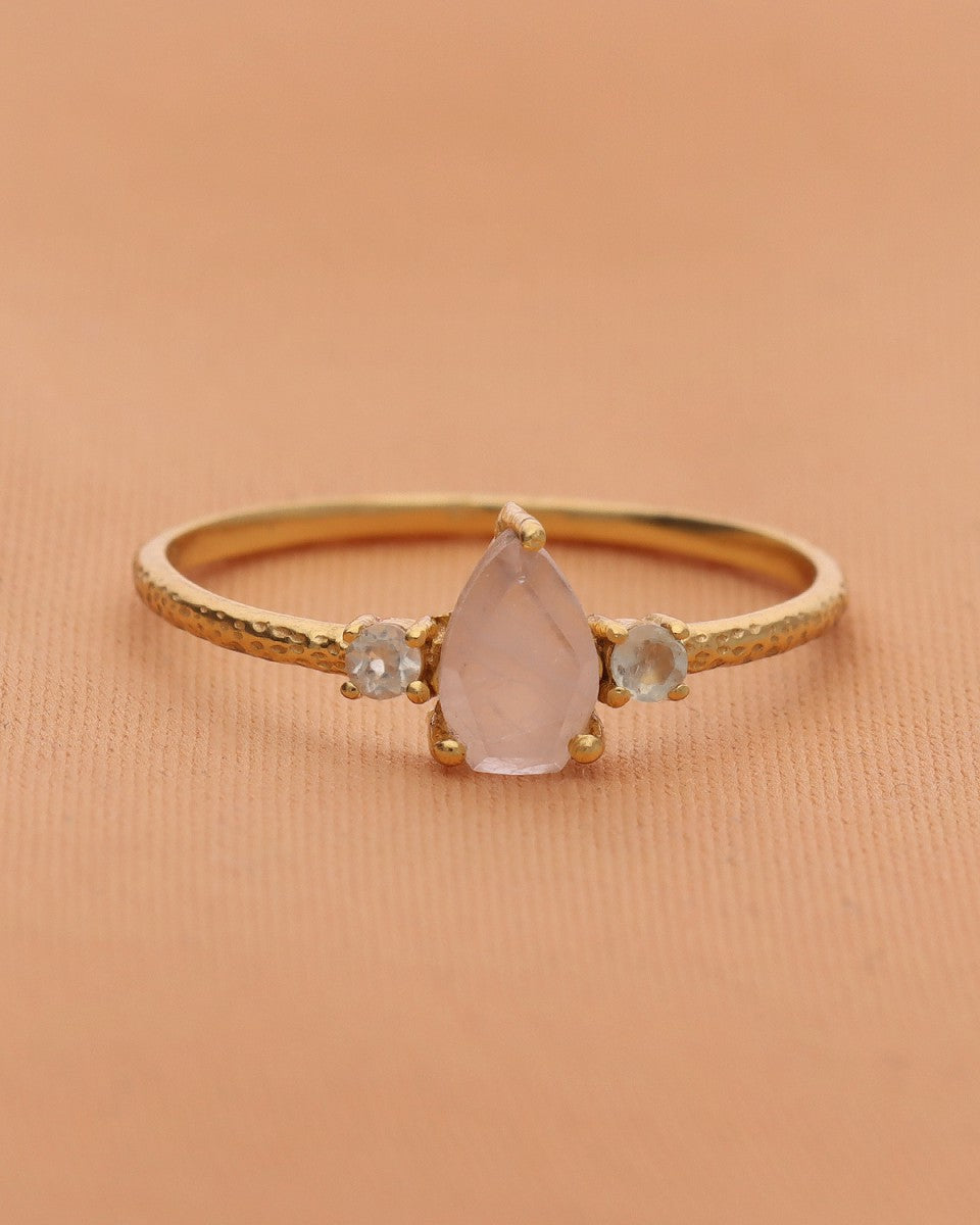 Bague en argent plaqué or, sublimée par une pierre semi-précieuse forme de diamant de 7 x 5 mm et deux pierres rondes de 2 mm, soigneusement taillée et mise en valeur par de subtils détails artisanaux.