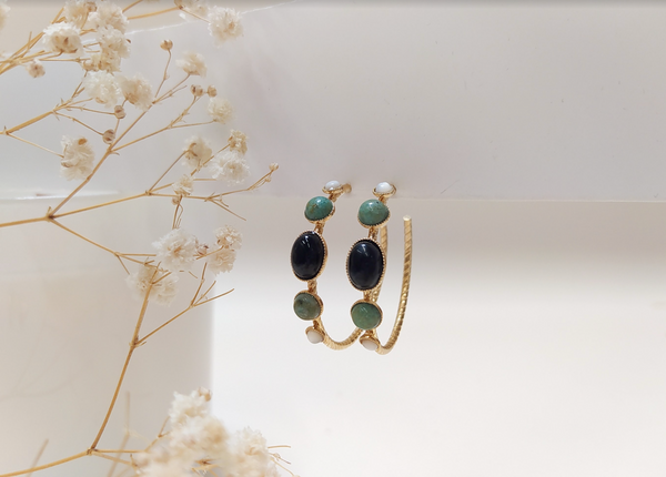 Composition: laiton doré à l'or fin et pierres naturelles : Nacre Blanche, Jaspe Africaine et Agate Noir. / Amazonite, Nacre Blanche et Quartz Rose.