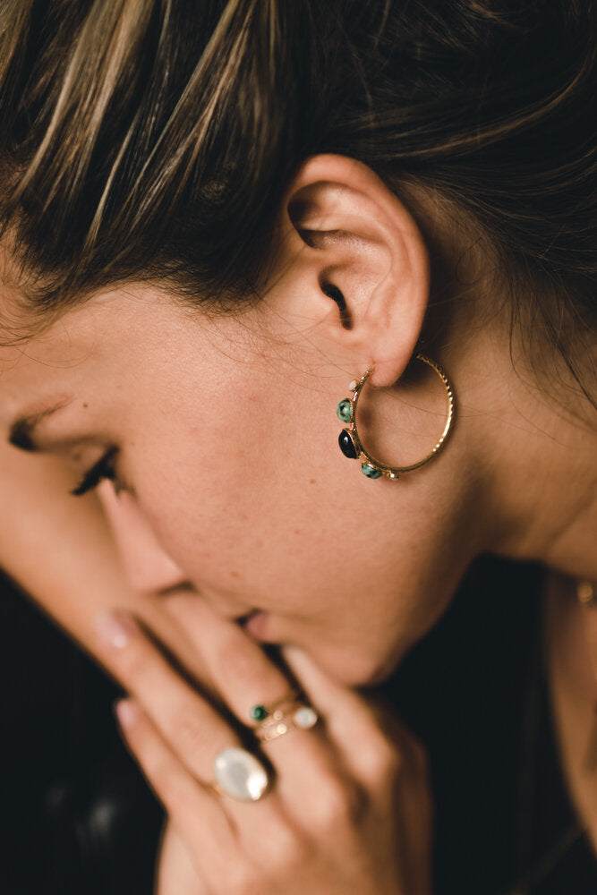 Créoles raffinées dorées sertiers de 5 pierres pour sublimer chaque femme avec un bijoux.