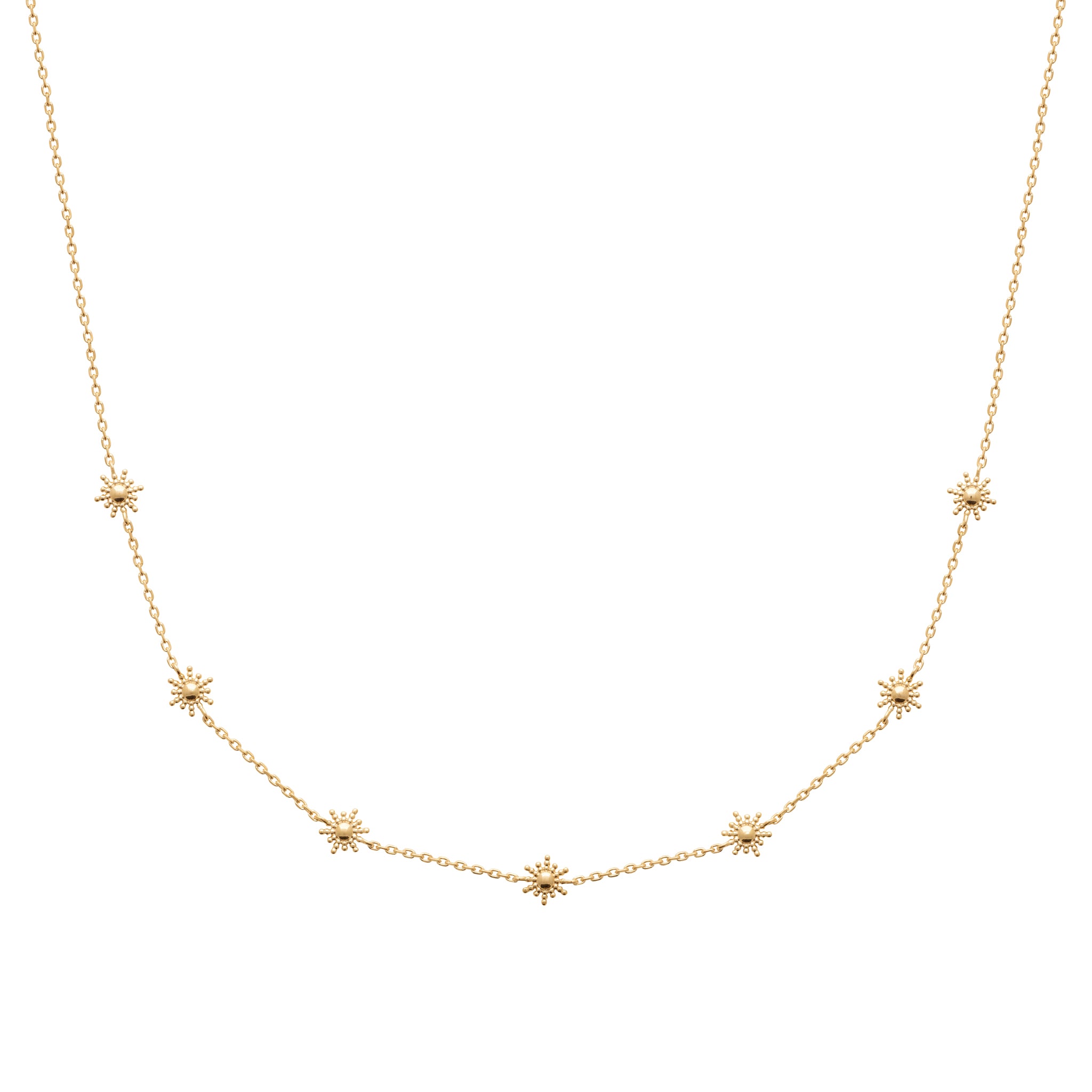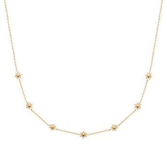 Le collier Astella se compose d’une fine chaîne dorée ponctuée de délicates étoiles scintillantes. Chaque motif, finement travaillé, reflète la lumière avec poésie et illumine le décolleté d’un éclat subtil. Une création élégante et intemporelle, idéale pour apporter une touche céleste à vos instants du quotidien comme à vos soirées d’exception.