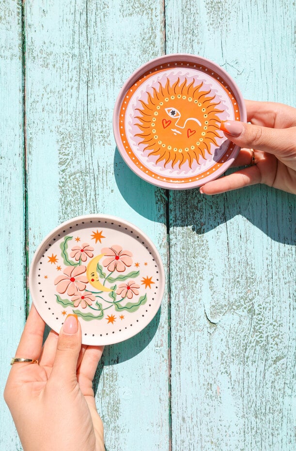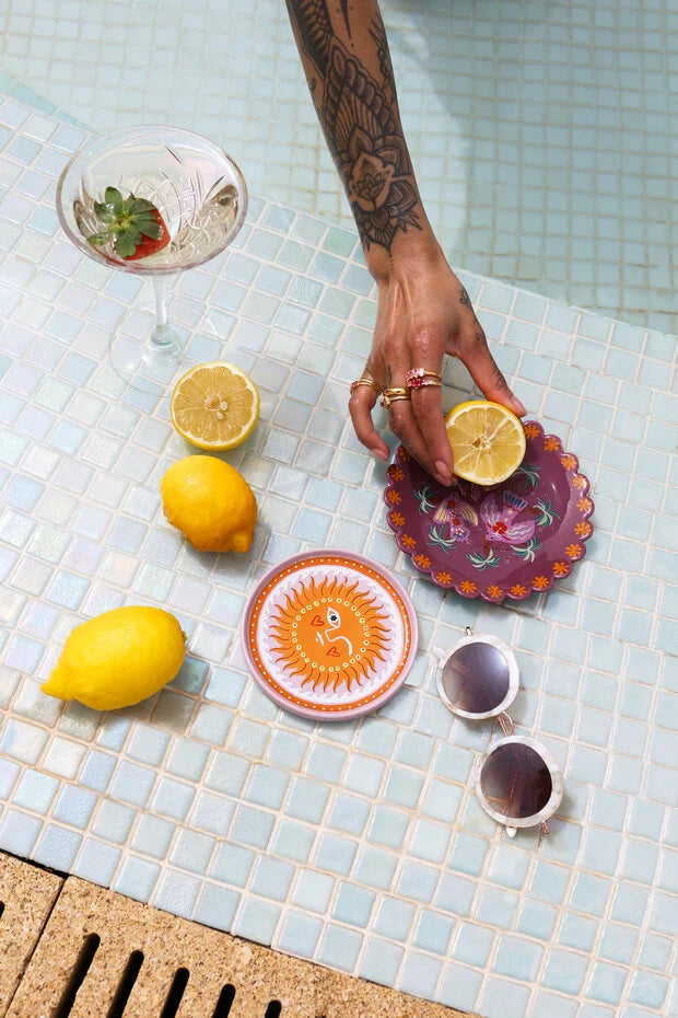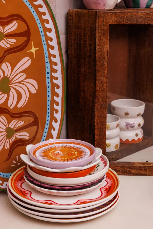 Rayonnante et pleine de bonne humeur, la petite assiette Soleil illumine votre table d’une touche rétro et joyeuse. Avec son design solaire aux teintes chaudes et son motif graphique unique, elle évoque les beaux jours et la convivialité. Parfaite pour égayer vos repas ou décorer votre intérieur avec éclat et originalité.