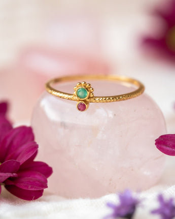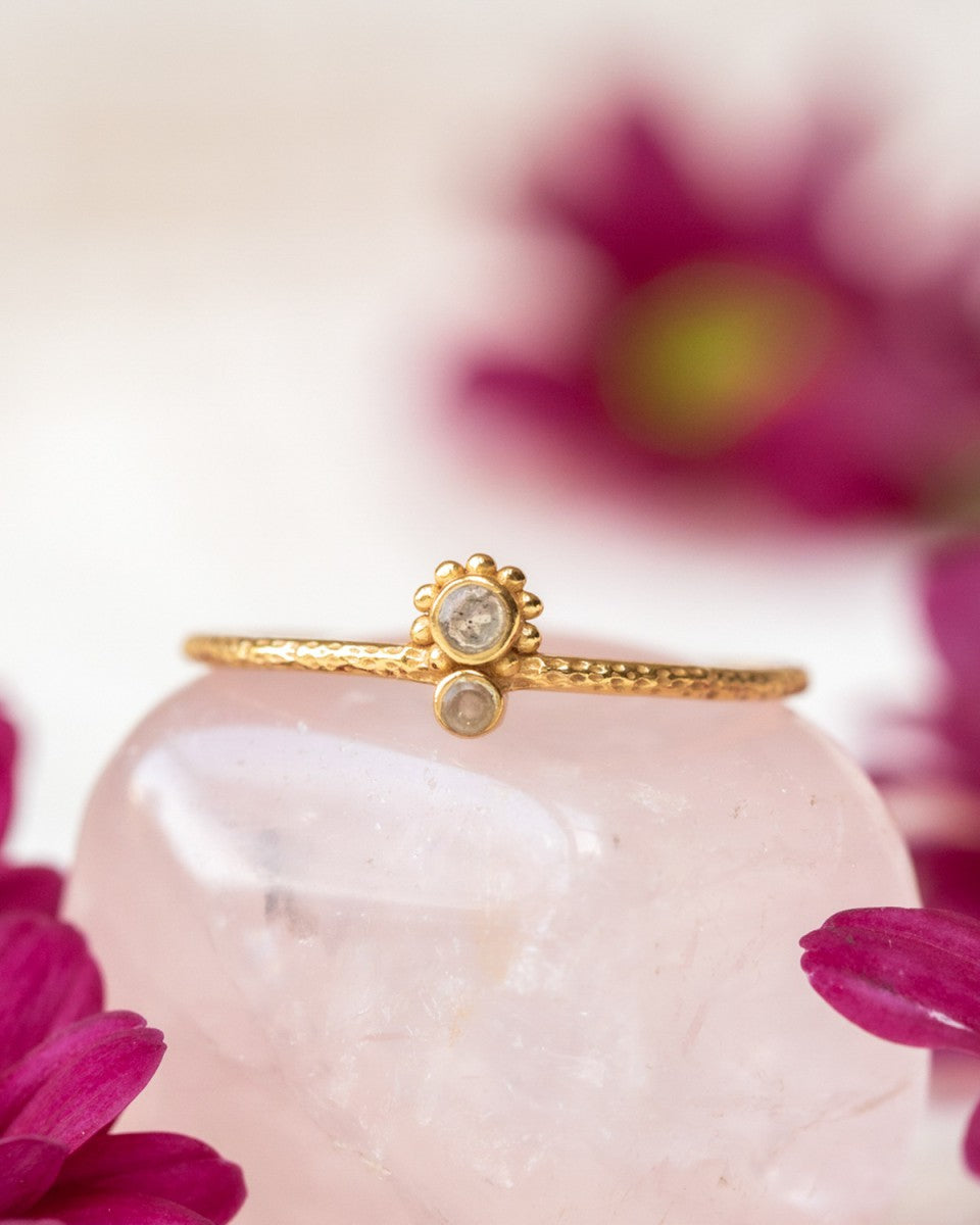La bague Chamomile est une ode à la douceur et à la lumière. Son anneau finement martelé met en valeur deux délicates pierres lumineuses, entourées d’un délicat motif doré inspiré des pétales de camomille. À la fois poétique et intemporelle, elle capte la pureté du naturel et sublime la féminité avec une élégance subtile.