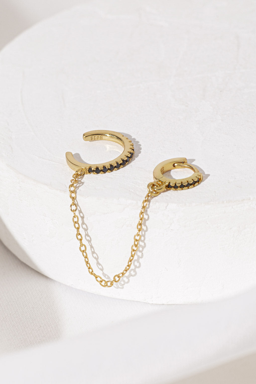 Une boucle d'oreille unique, sertie de pierres de zircone et combinée à une chaîne délicate pour former une boucle d'oreille similaire.
