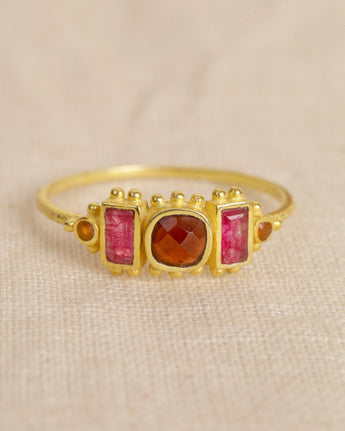 La bague Komi célèbre la chaleur et la vitalité des pierres solaires. Son design géométrique associe l’intensité de la pierre à la douceur de la monture, créant une harmonie vibrante et lumineuse. Sertie d’or fin, chaque pierre capte la lumière avec éclat, rappelant la puissance et la sensualité du feu. Une bague audacieuse et féminine, à porter seule ou en accumulation pour affirmer son style avec élégance.