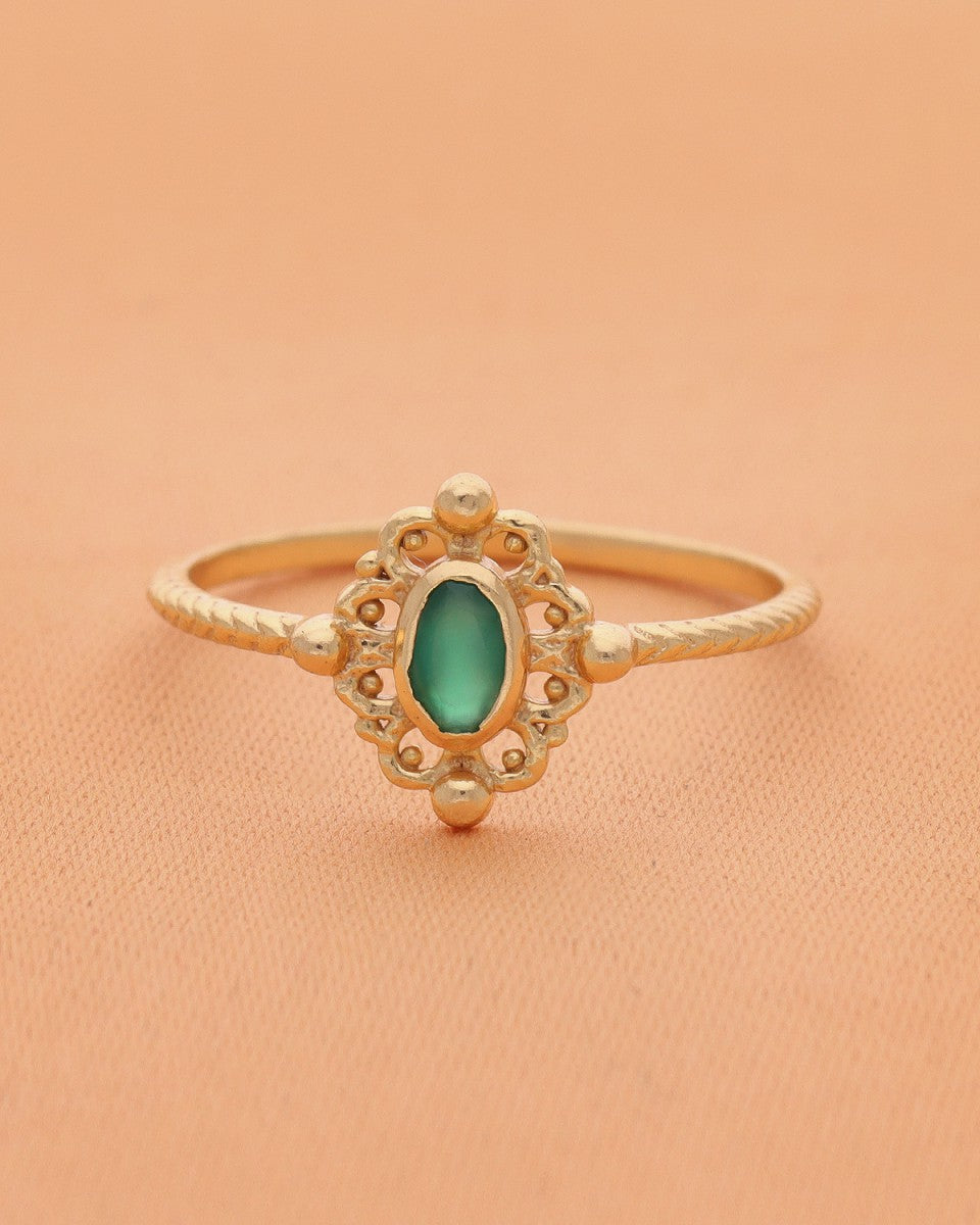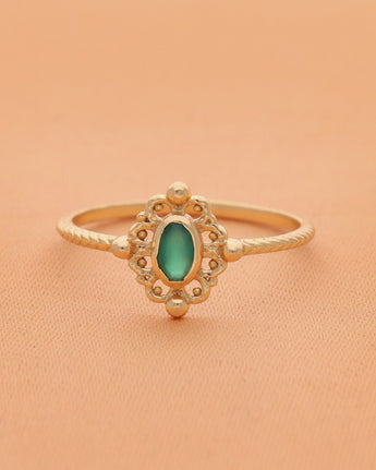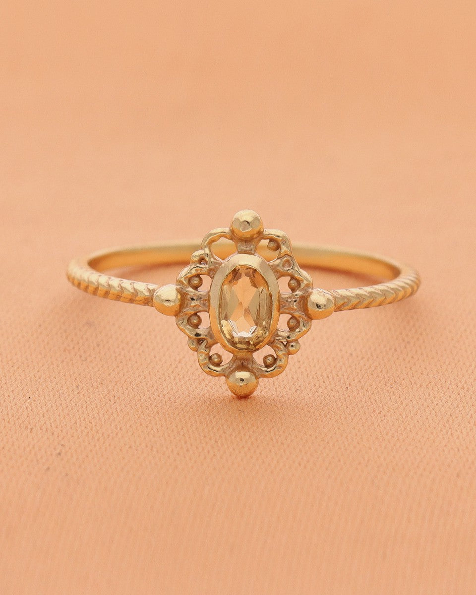 La bague Balsam célèbre la grâce et la lumière. Son anneau délicatement torsadé encadre une pierre lumineuse aux reflets dorés, mise en valeur par un motif ajouré d’inspiration florale. Chaque détail évoque la finesse des ornements anciens, pour une allure à la fois poétique et précieuse. Symbole d’élégance et d’harmonie, la Balsam illumine la main d’une touche de douceur solaire.