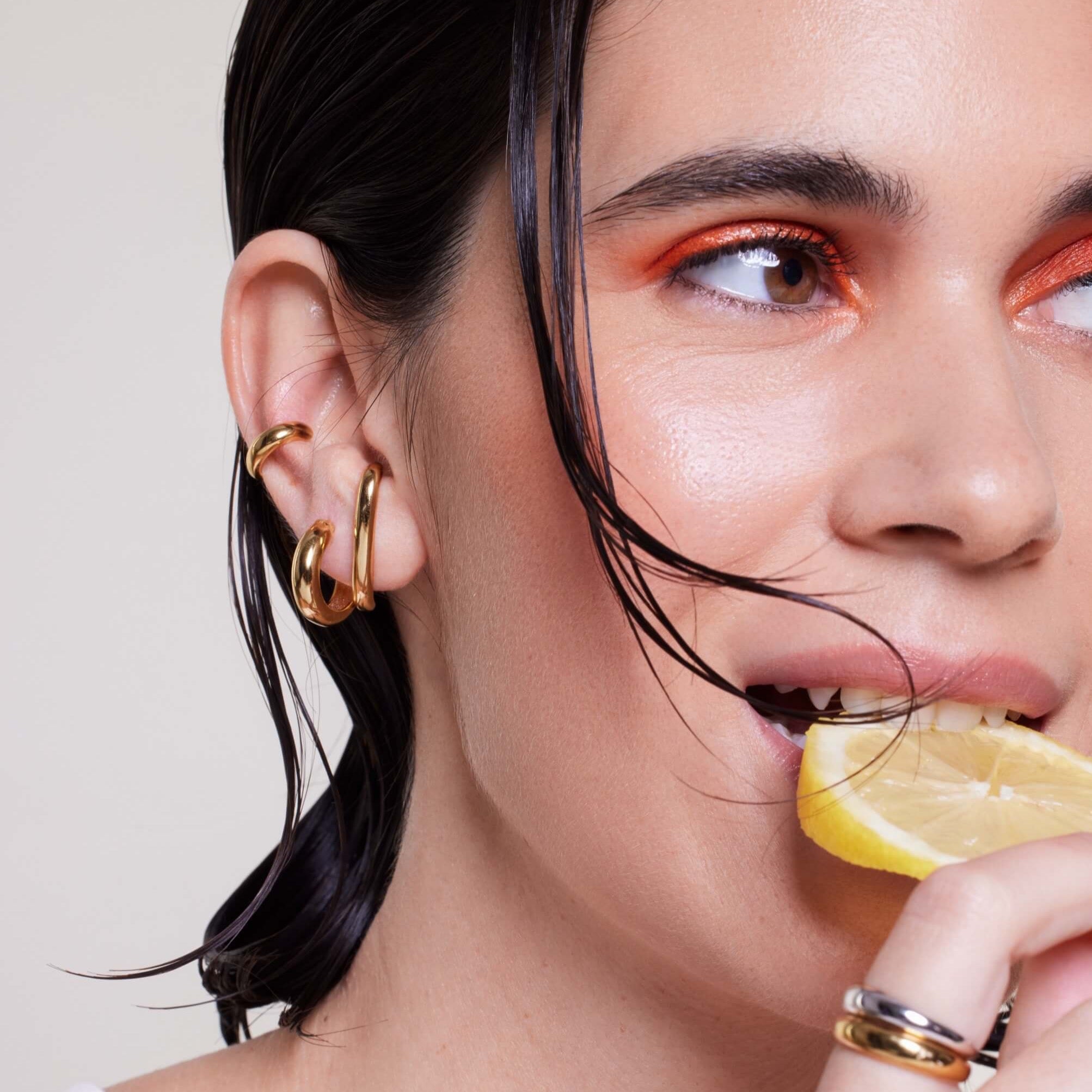 Sur les photos portées, le mannequin porte également la bague d'oreille Maui, les boucles Positano et Tahiti, les mini créole Honolulu et San Francisco.