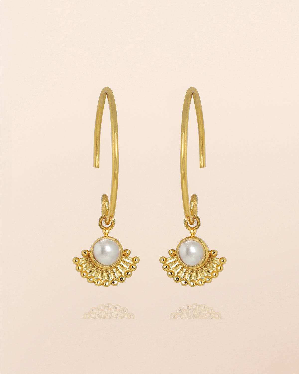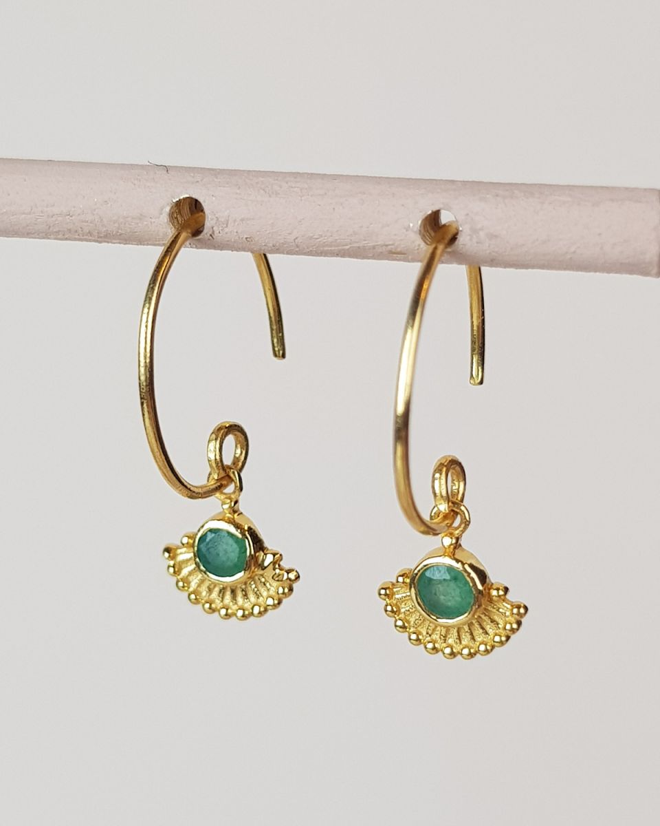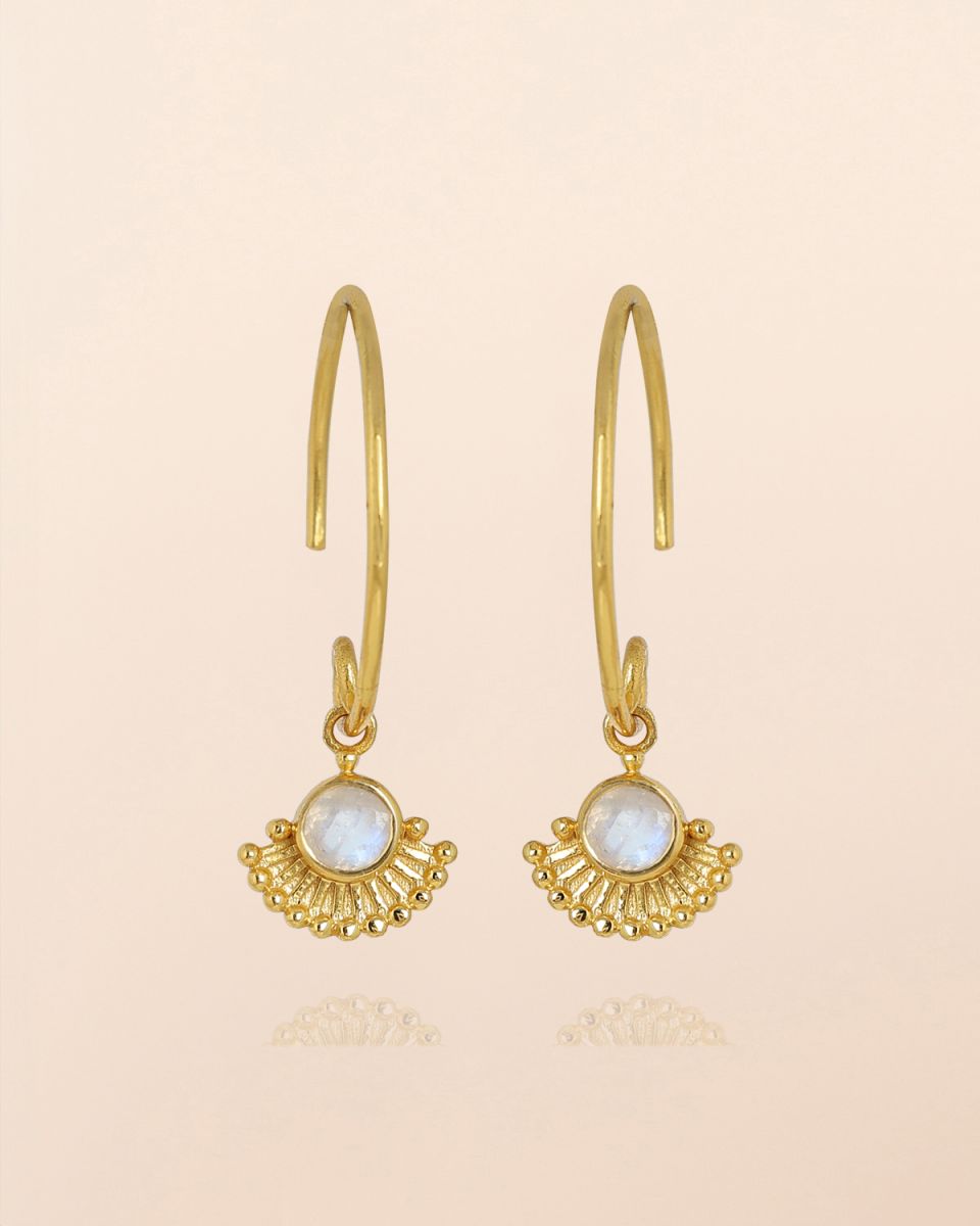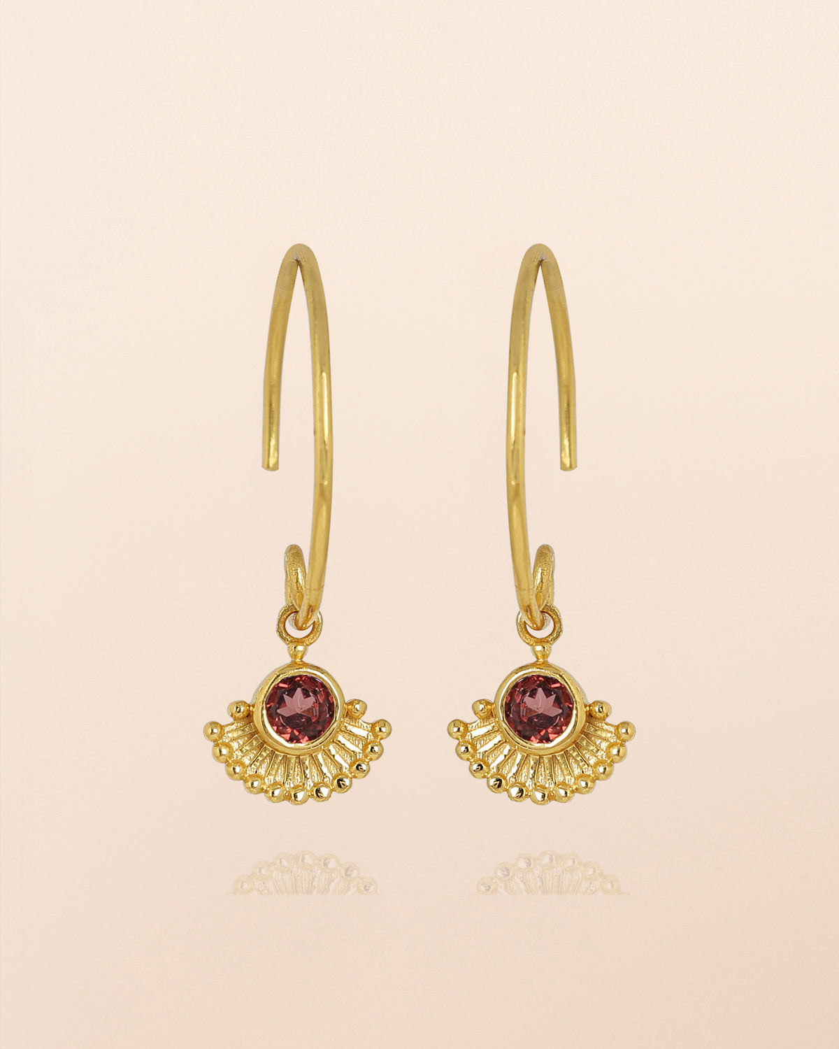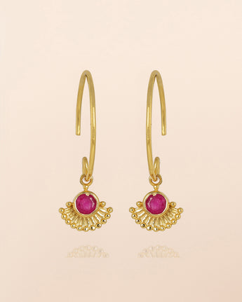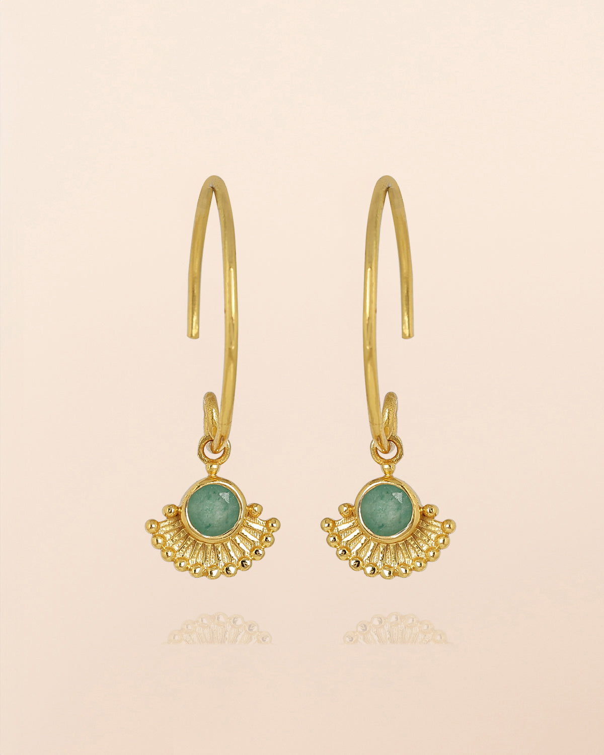 Les boucles pendantes Dorado capturent l’éclat du soleil couchant dans un design à la fois délicat et audacieux. Leur forme en éventail doré encadre une pierre, symbole de féminité et de vitalité. L’association subtile de la lumière dorée et des nuances vibrantes crée un bijou rayonnant, parfait pour illuminer vos journées comme vos soirées.