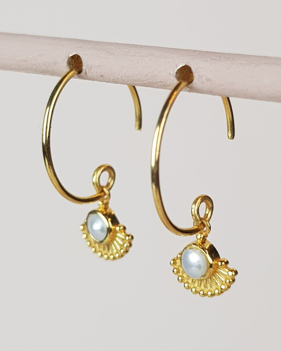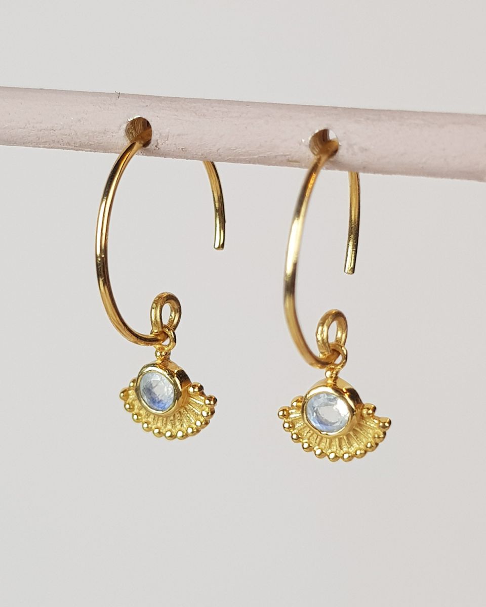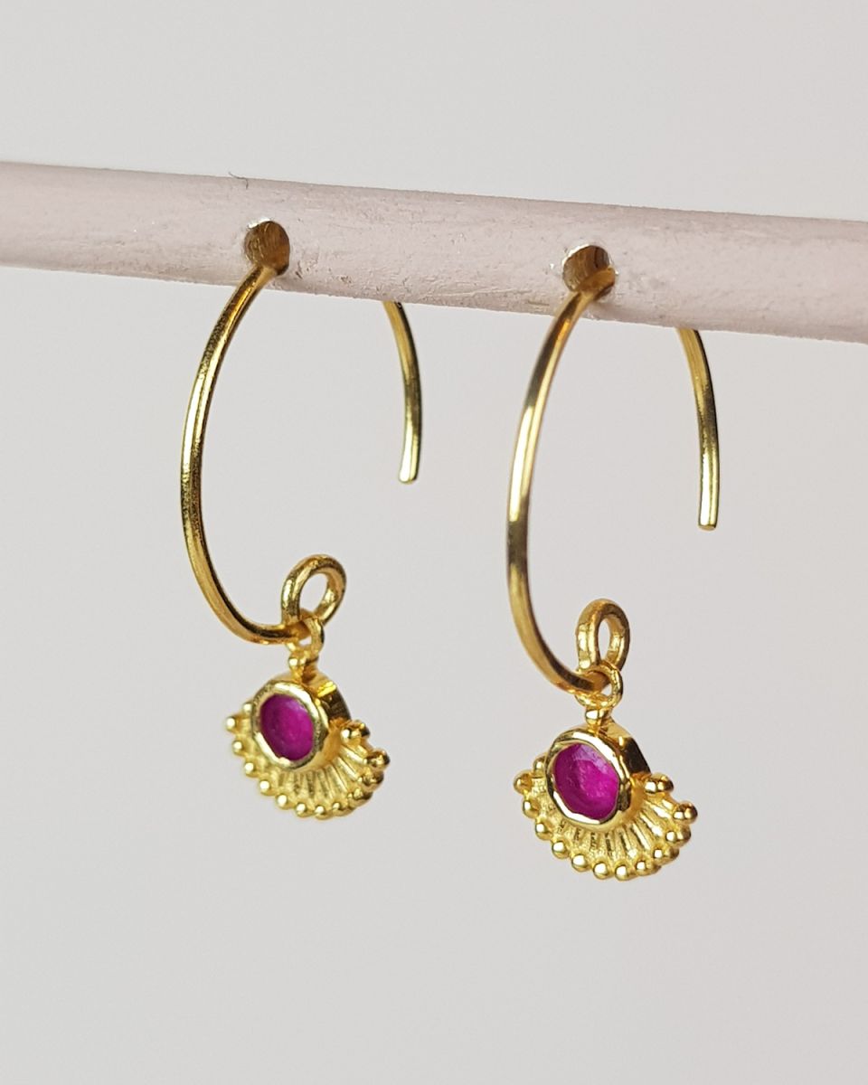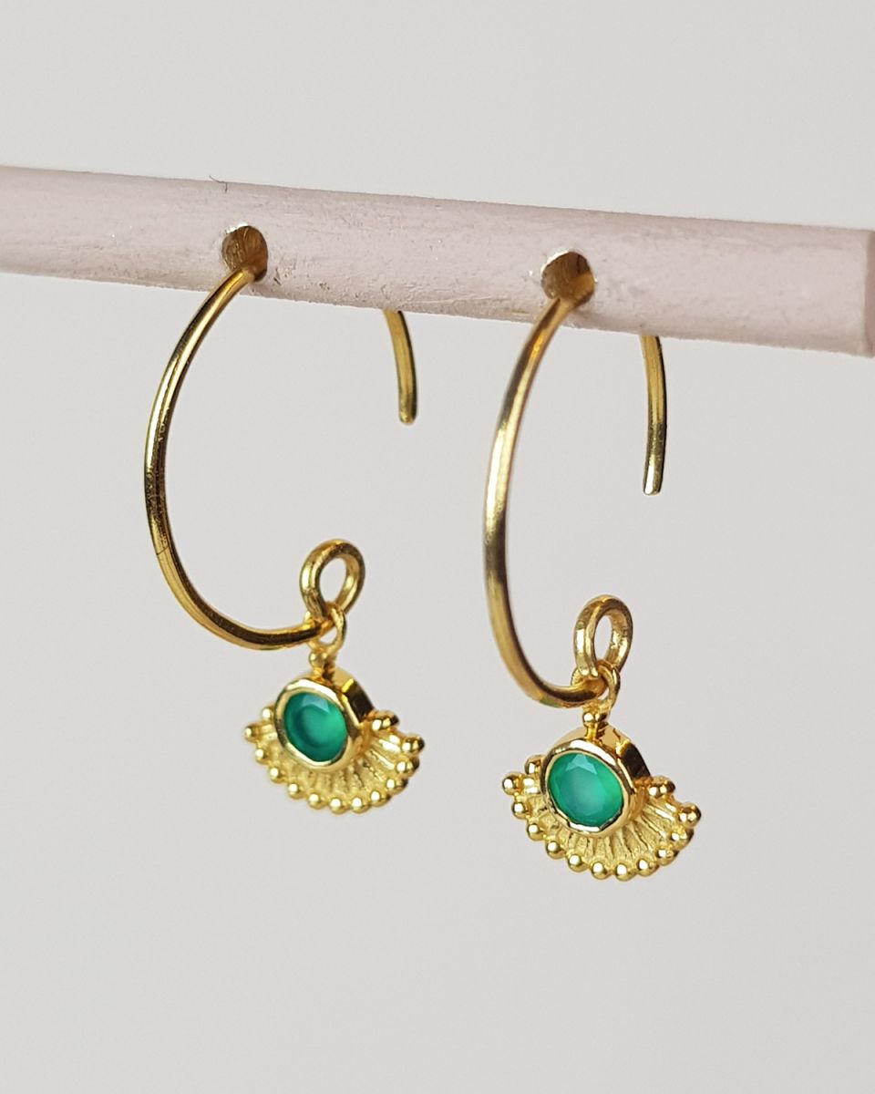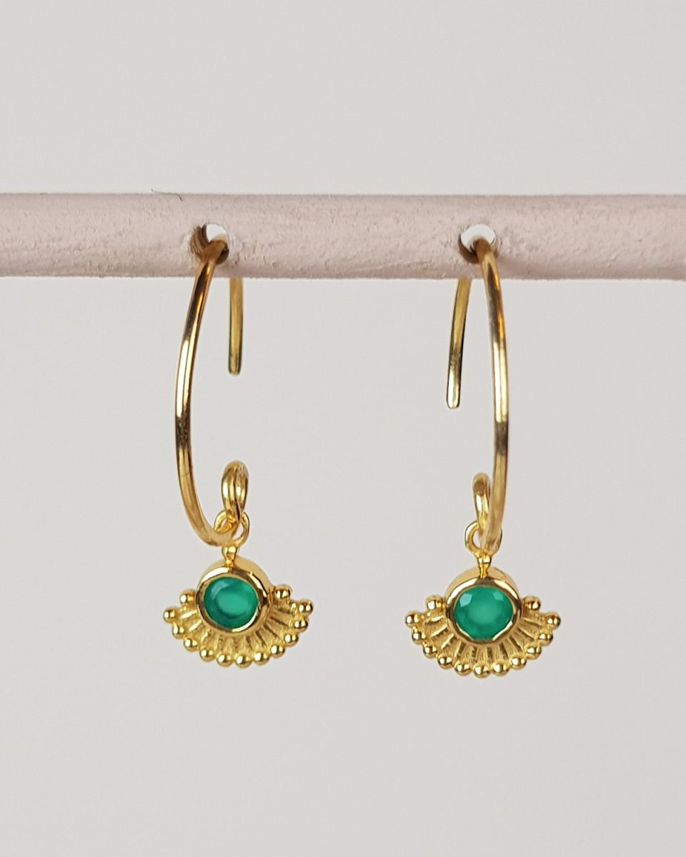 Les boucles pendantes Dorado capturent l’éclat du soleil couchant dans un design à la fois délicat et audacieux. Leur forme en éventail doré encadre une pierre, symbole de féminité et de vitalité. L’association subtile de la lumière dorée et des nuances vibrantes crée un bijou rayonnant, parfait pour illuminer vos journées comme vos soirées.