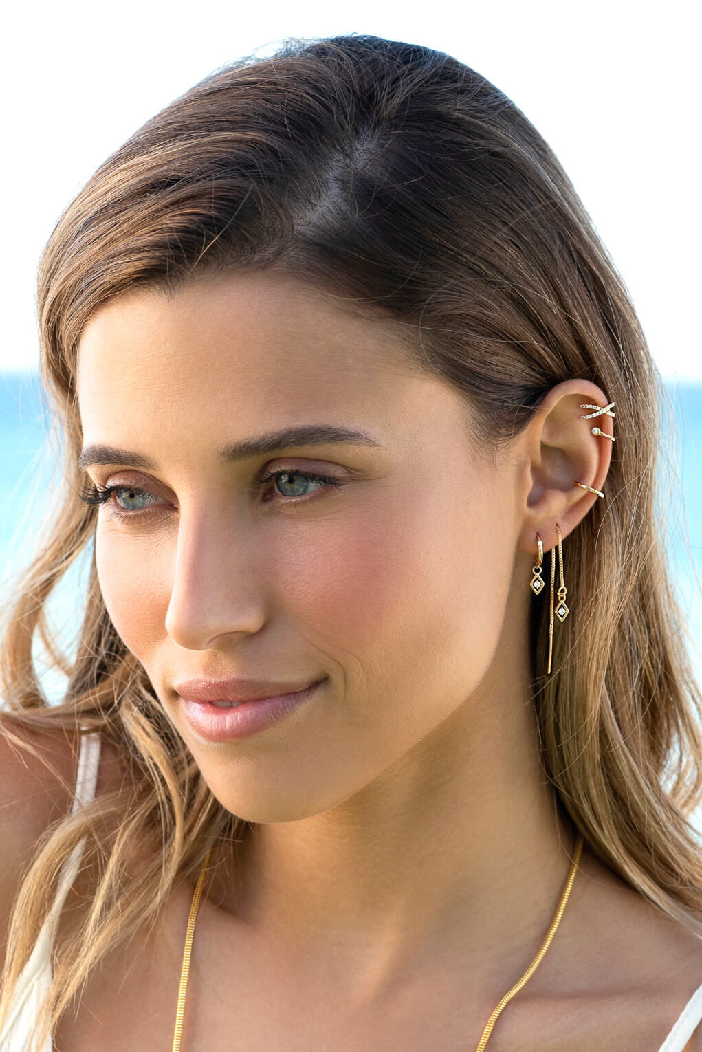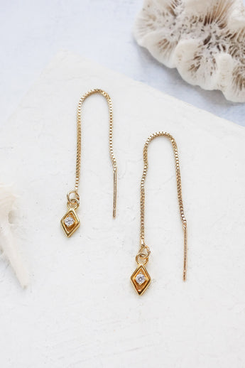 Boucles longues Alaia: Boucles d'oreilles délicates, composées de deux éléments en forme de diamant décorés de pierres de zircone, suspendus à une chaîne délicate. Se combinent bien avec d'autres boucles d'oreilles ou seules.