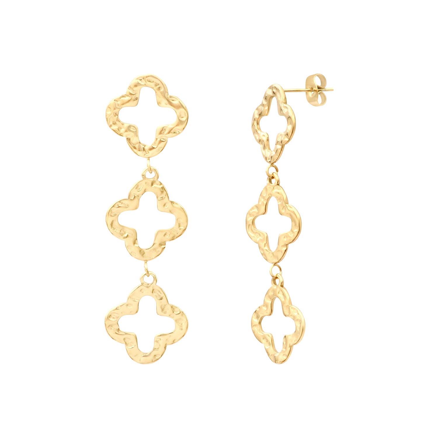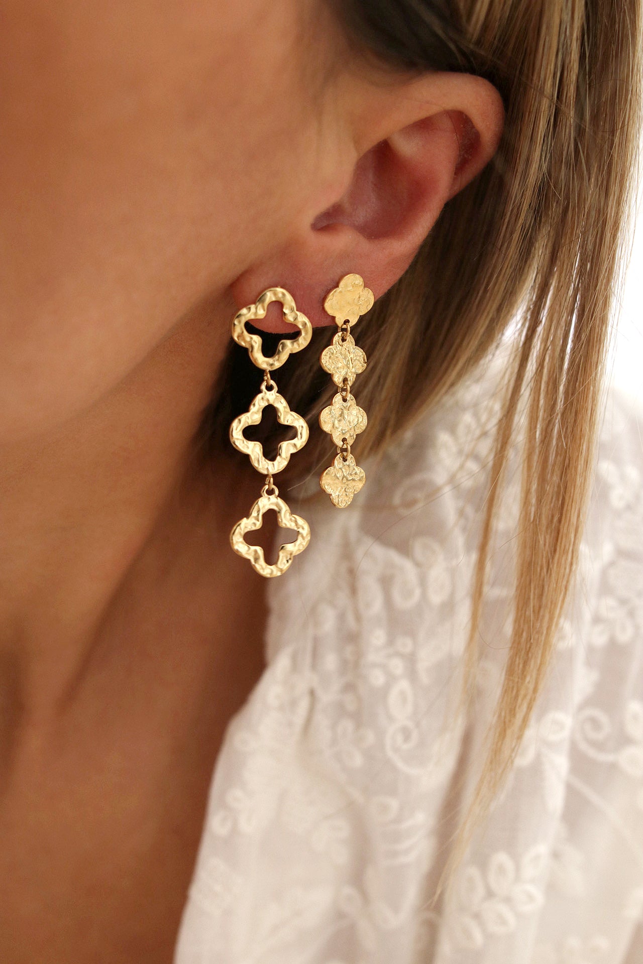 Les boucles d’oreilles Auriane séduisent par leur design ajouré en forme de trèfle revisité, sublimé par un fini martelé qui capte la lumière à chaque mouvement. Raffinées et audacieuses, elles apportent une touche de caractère et d’élégance solaire à vos tenues, de jour comme de nuit.