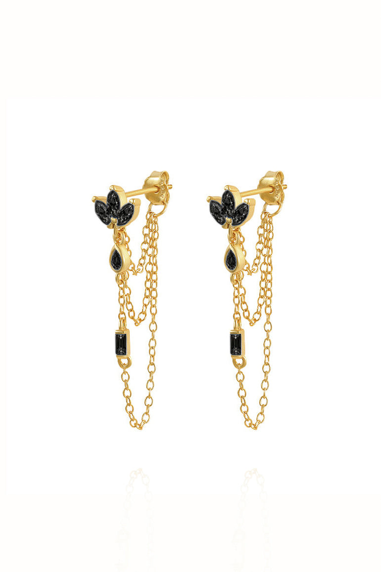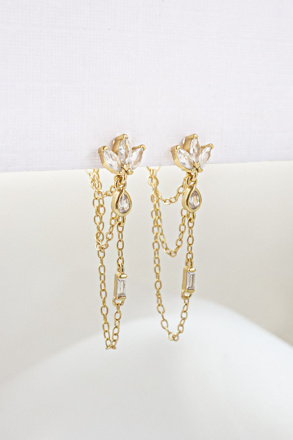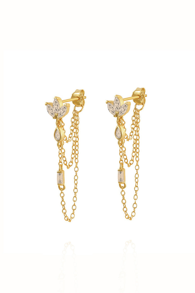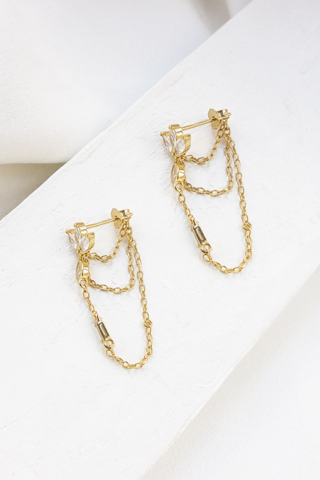 Les boucles d’oreilles Zoé incarnent l’élégance moderne dans toute sa subtilité. Leur design doré, rehaussé de délicates pierres scintillantes, s’orne de fines chaînettes dorées qui ajoutent un mouvement fluide et raffiné à chaque port.
