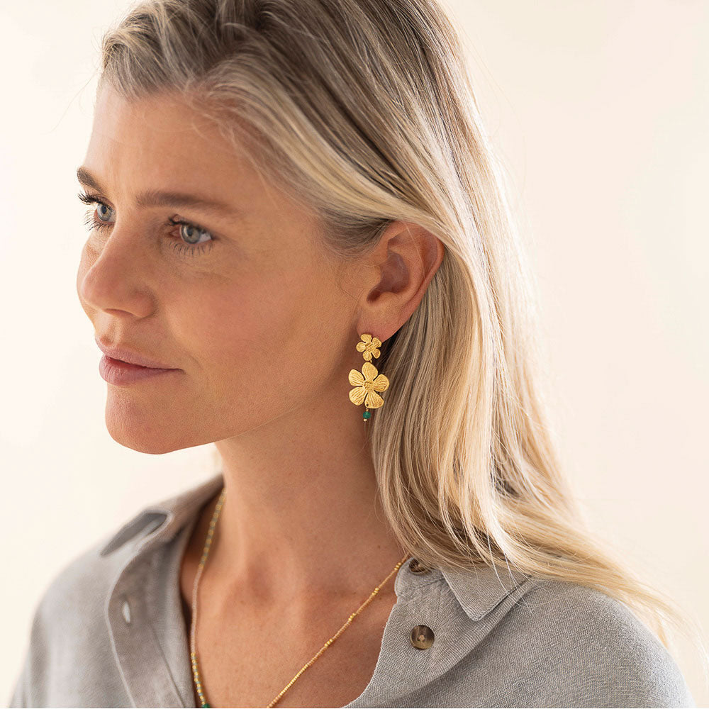 Les Boucles Expressive plaquées or sont des bijoux faits main, composés de deux fleurs d’hibiscus dorées, la plus petite servant de clou d’oreille. L’hibiscus symbolise la beauté, la féminité et la lumière du soleil, apportant une touche lumineuse à votre style.