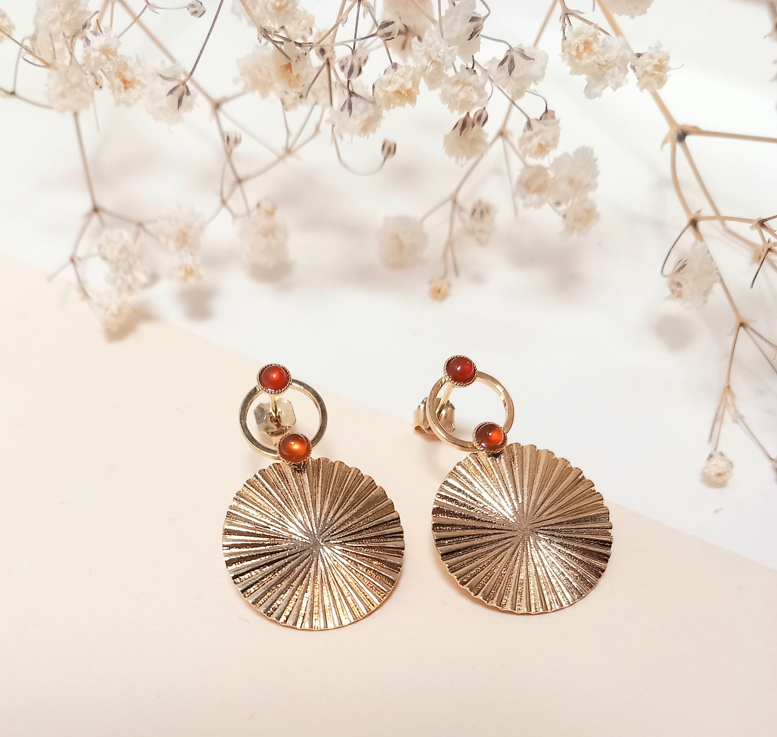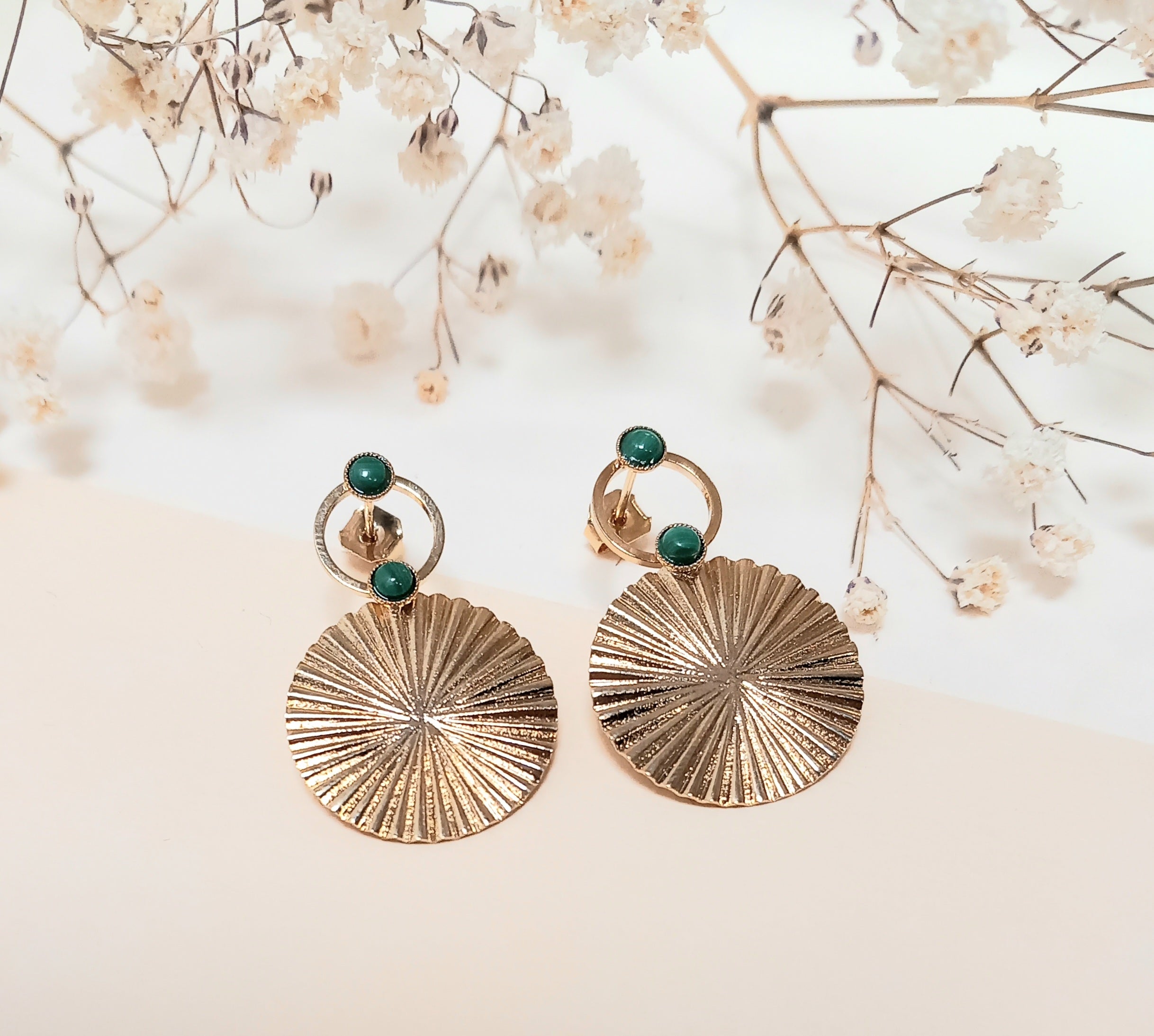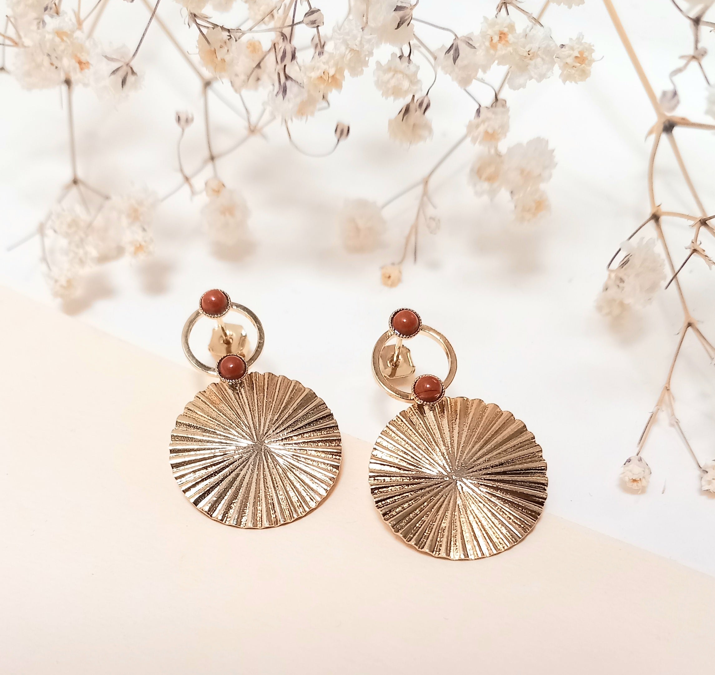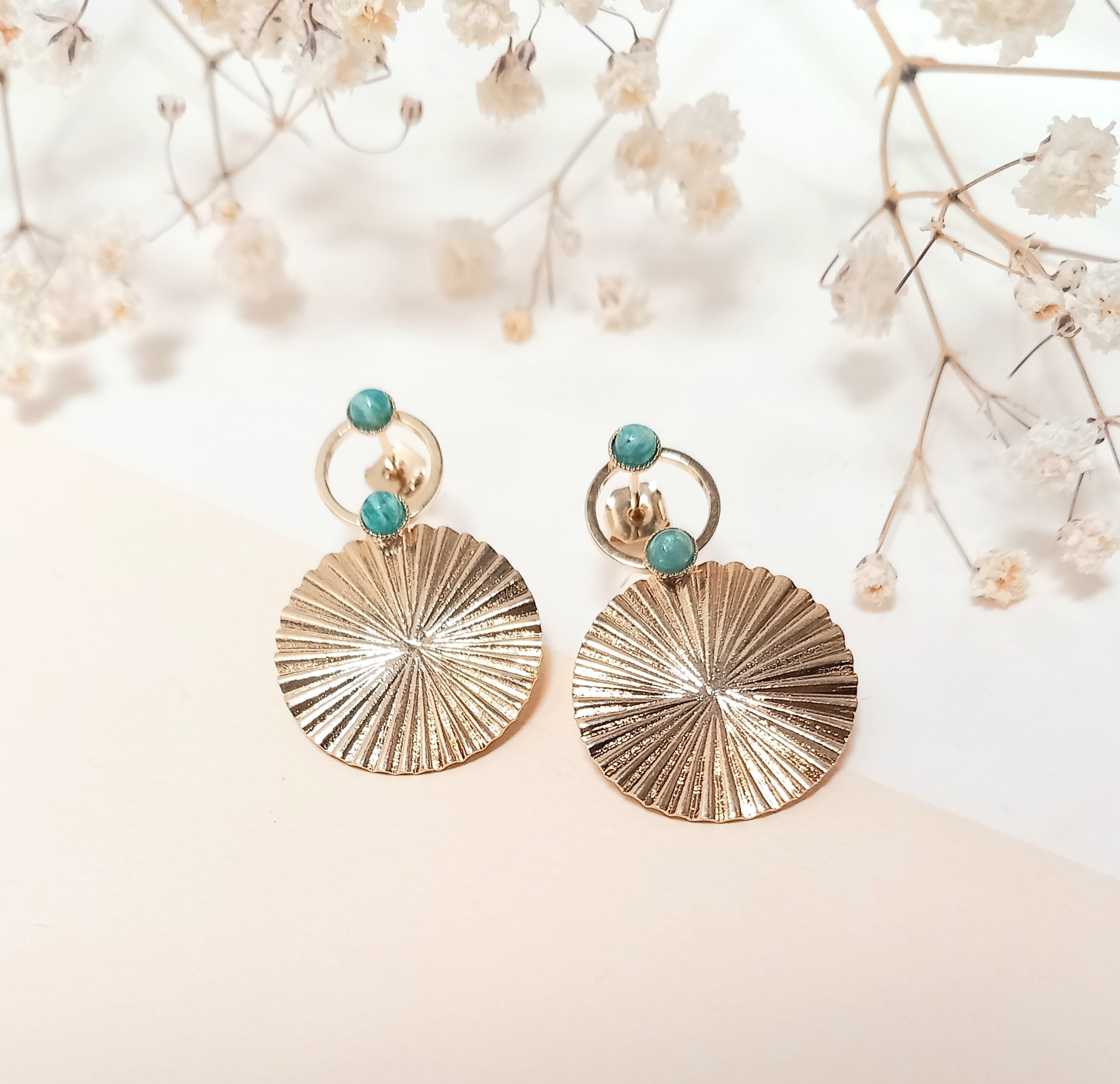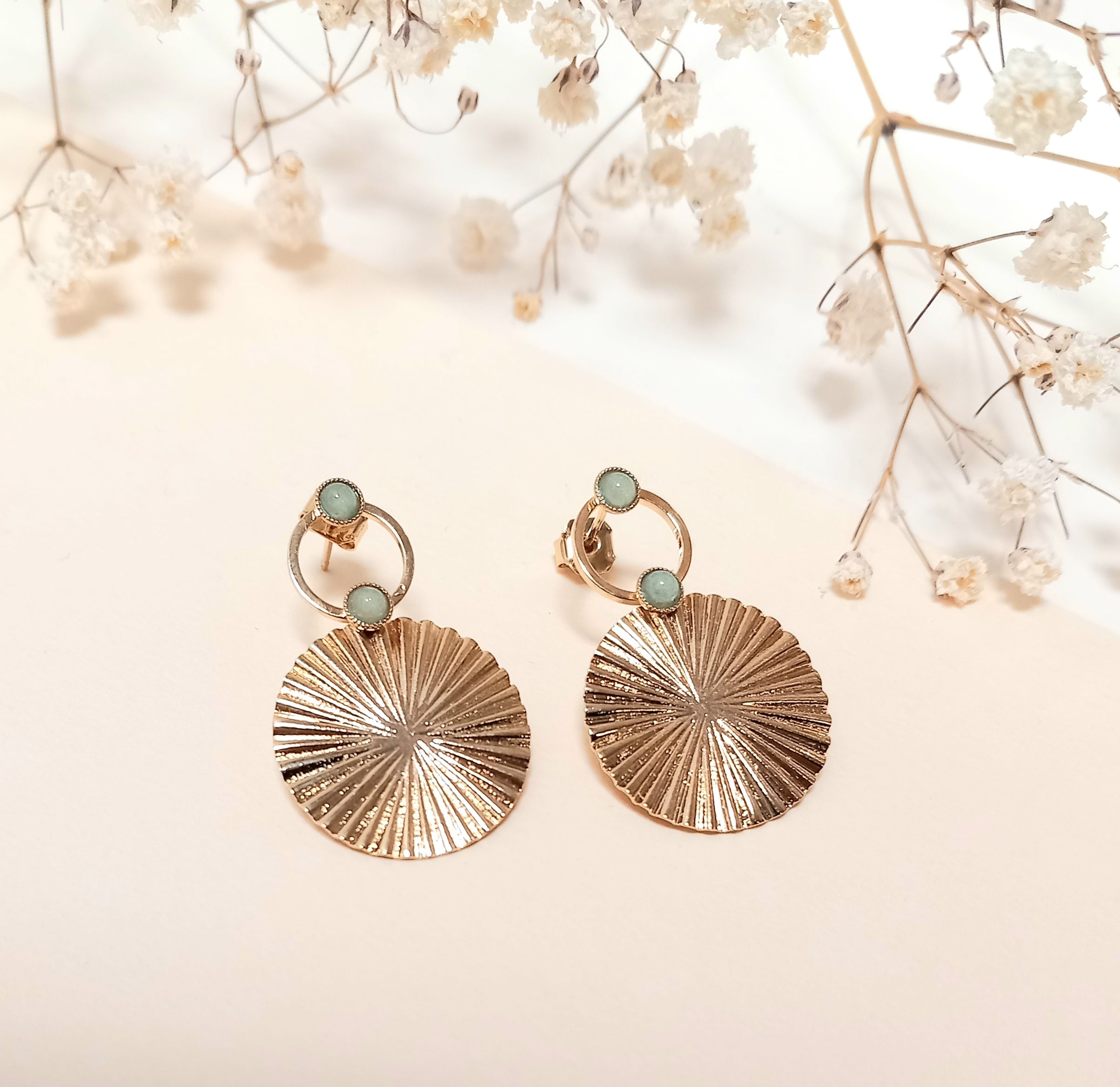 Boucles d'oreilles composées d'un petit anneau avec deux pierres semi-précieuses et d'un disque doré… pour sublimer chaque femme avec un bijou!