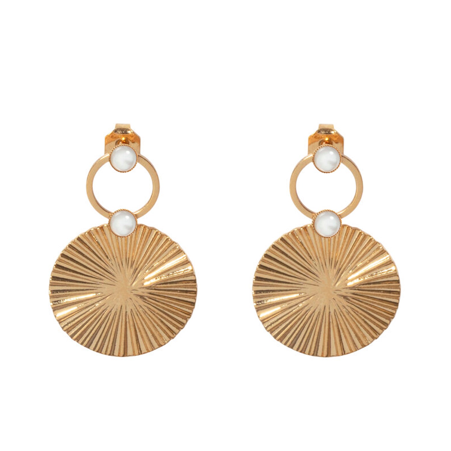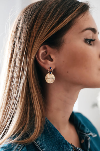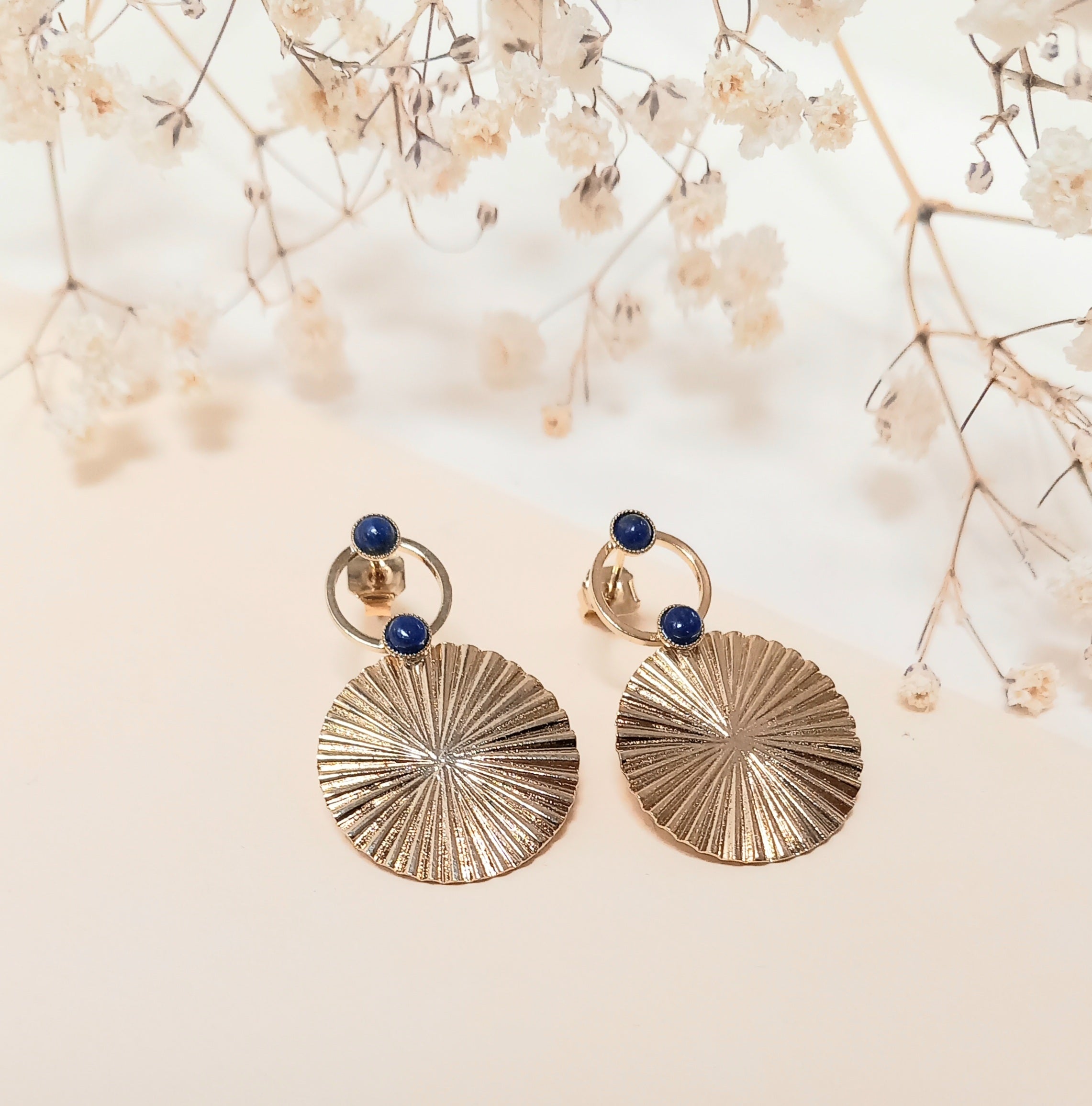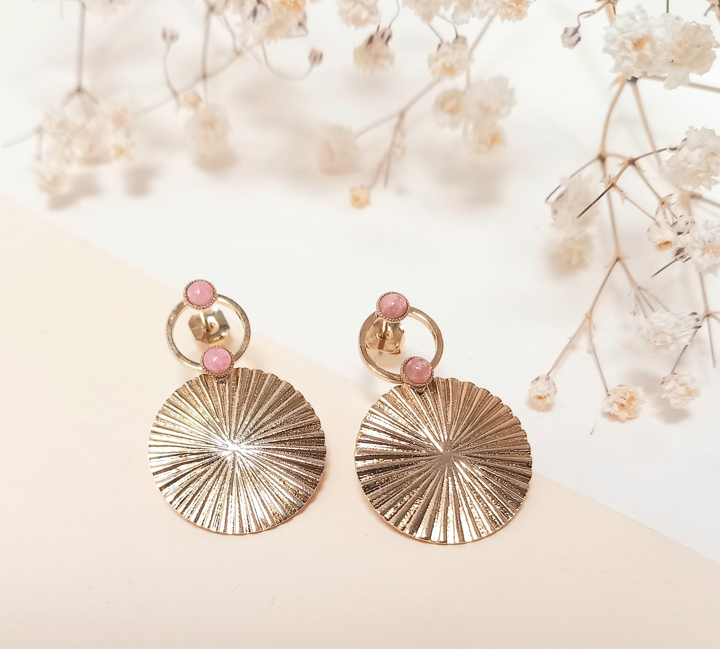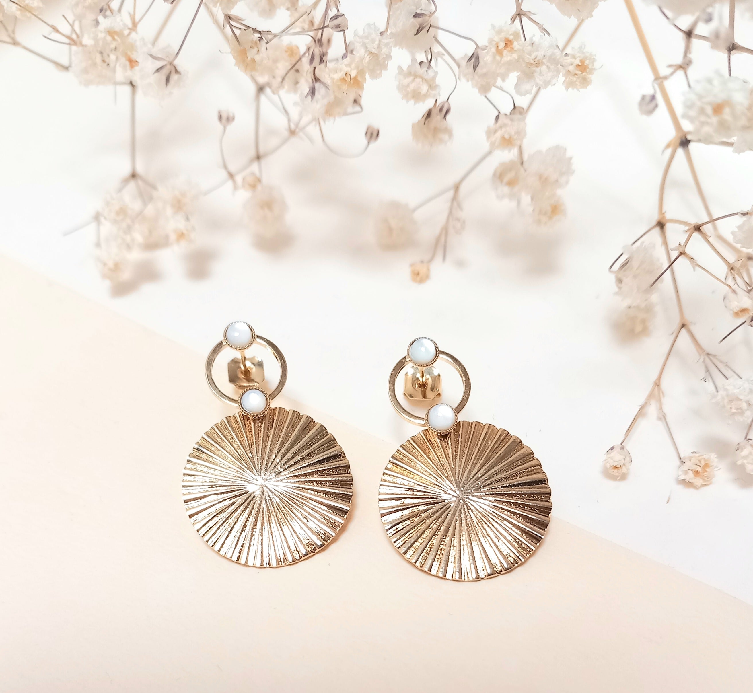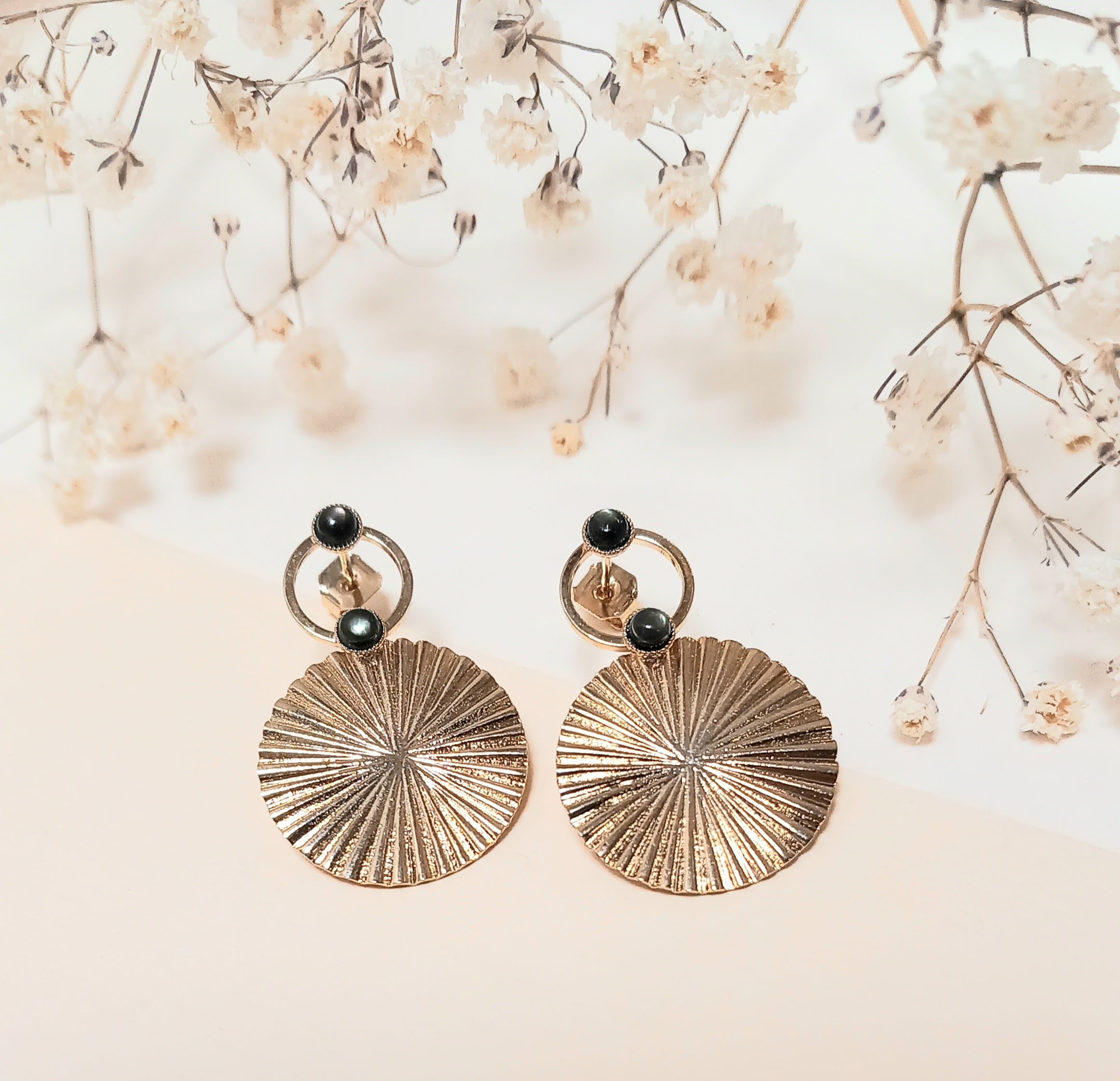 Boucles d'oreilles composées d'un petit anneau avec deux pierres semi-précieuses et d'un disque doré… pour sublimer chaque femme avec un bijou!