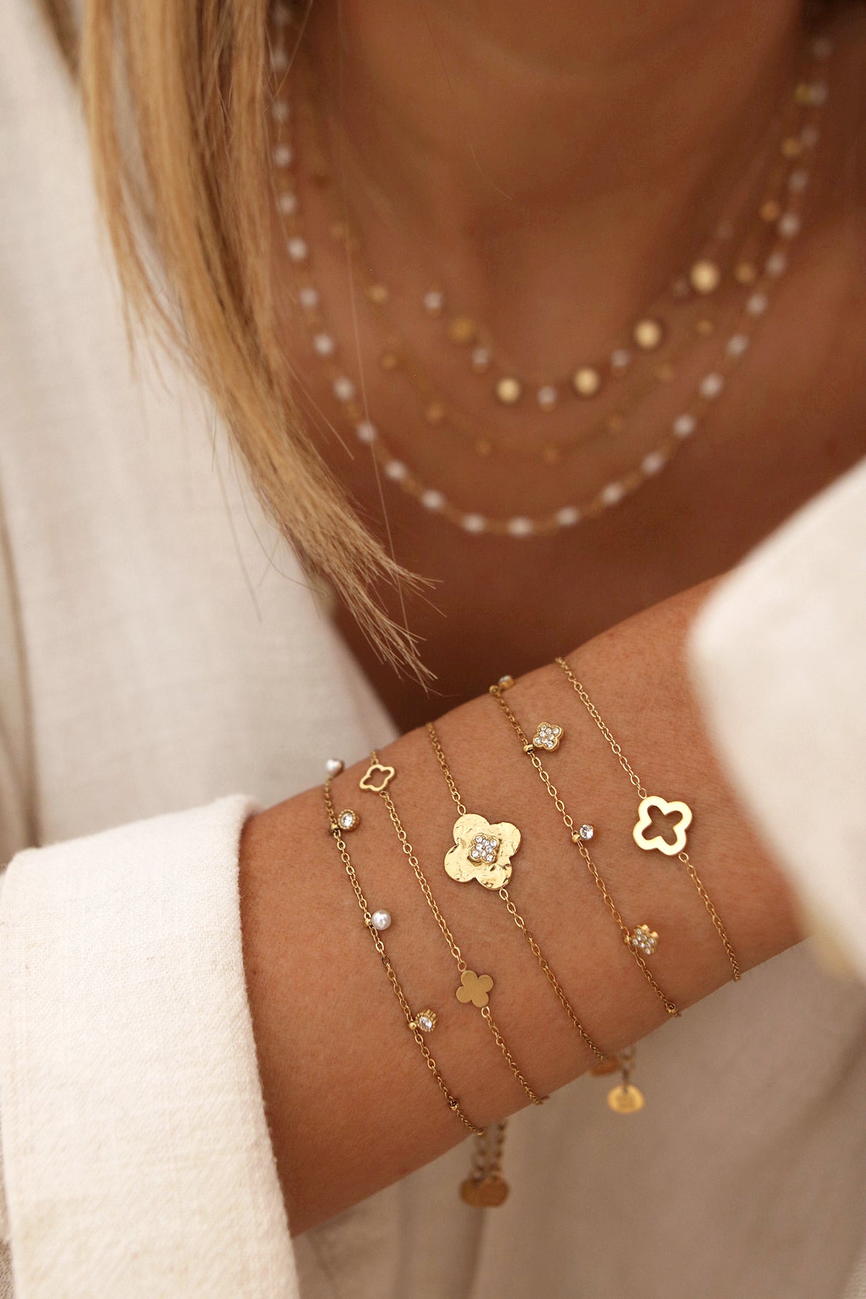 Le bracelet Cléa se distingue par son motif ajouré en forme de trèfle, sublimé d’un pavage délicat de zircons scintillants. Monté sur une fine chaîne dorée, il reflète la lumière avec élégance et apporte une touche de grâce intemporelle au poignet. Une création raffinée, parfaite pour illuminer vos instants du quotidien comme vos occasions d’exception.