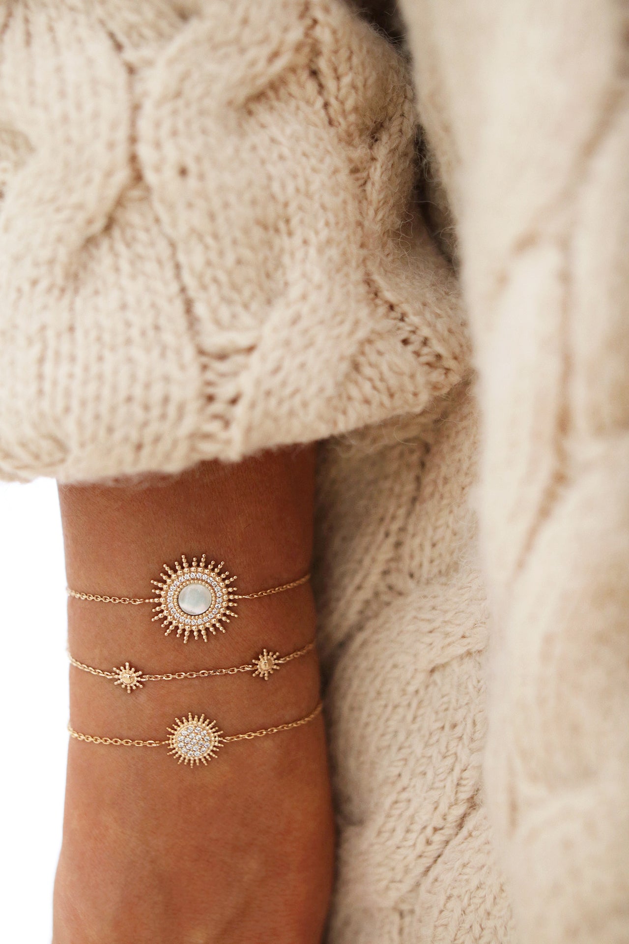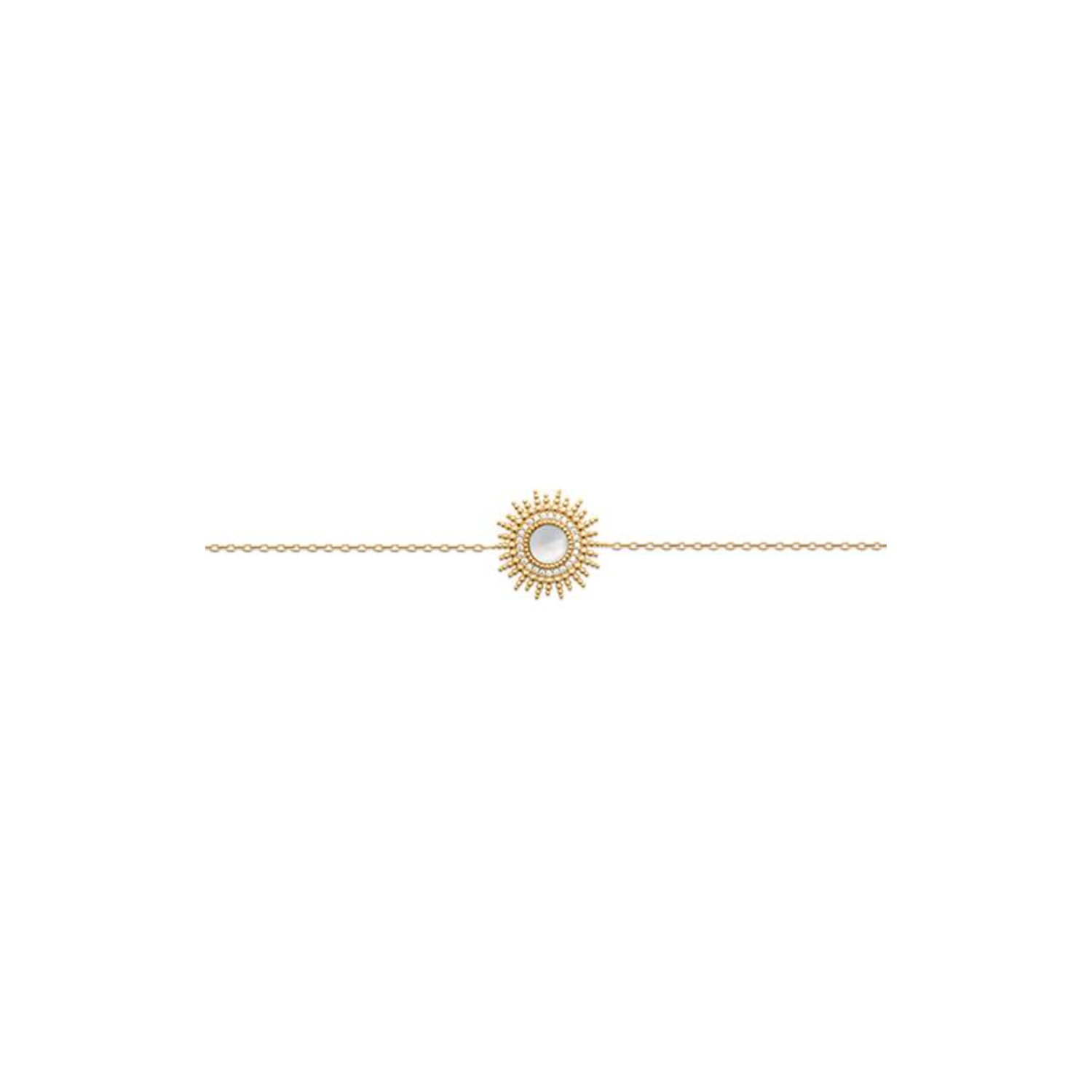 Le bracelet Elora capture toute la splendeur solaire avec son médaillon rayonnant serti de nacre. Monté sur une fine chaîne dorée, il illumine le poignet d’une aura éclatante et délicate. Un bijou lumineux, symbole d’élégance et de féminité intemporelle.