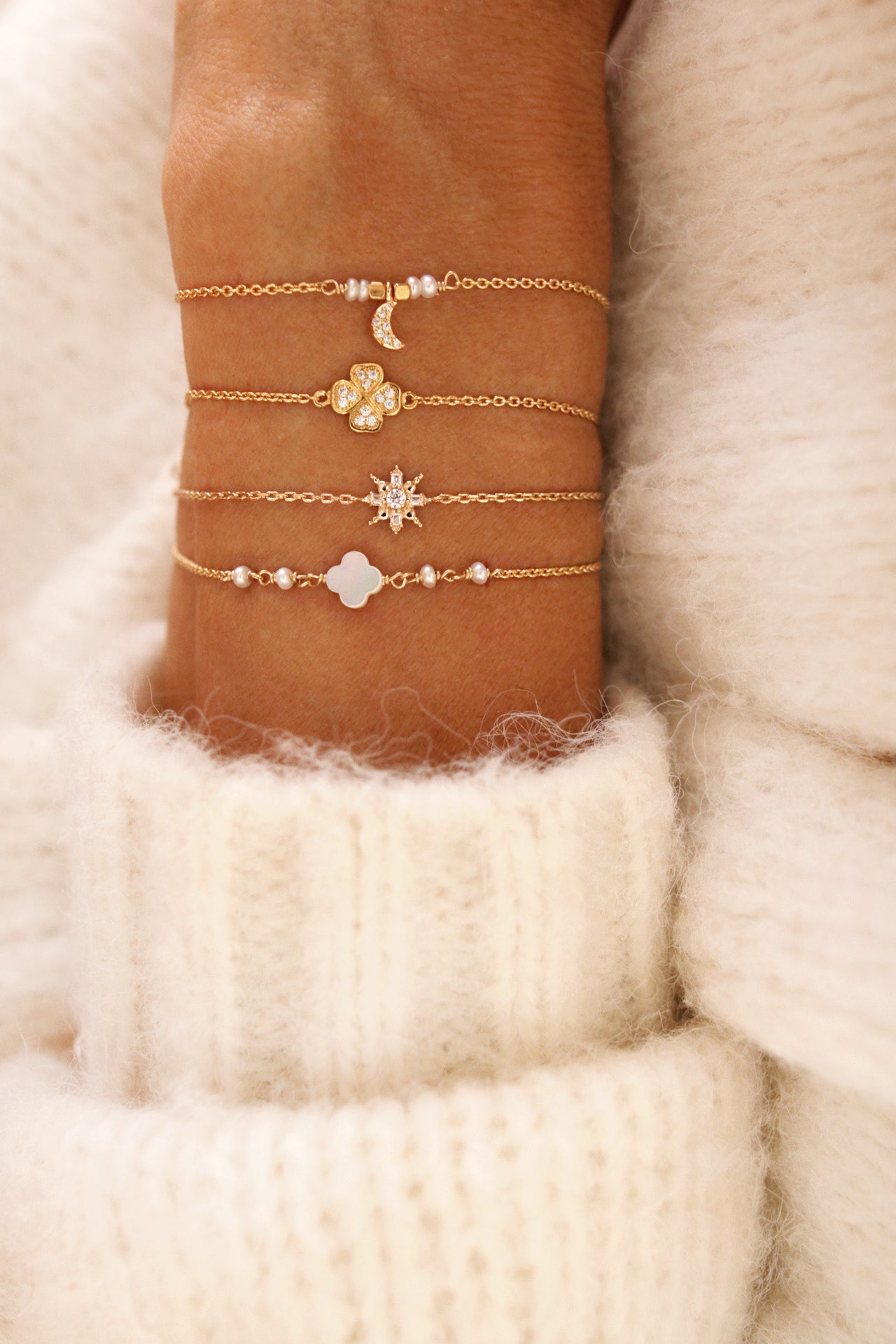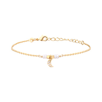 Le bracelet Lunara illumine votre poignet avec sa délicate chaîne dorée ornée de petites perles fines, sublimée par un pendentif lune pavé de zircons étincelants. Son design raffiné mêle douceur et éclat céleste, pour un bijou qui capture la magie des nuits étoilées. Une pièce précieuse et féminine qui accompagne avec poésie vos instants du quotidien comme vos soirées élégantes.