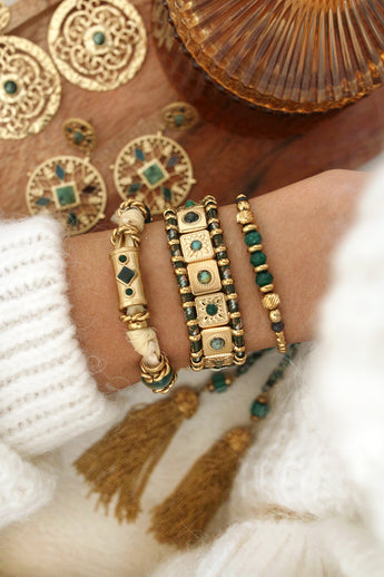 Le bracelet Padma séduit par sa finesse et son éclat doré. En acier inoxydable orné de pierres naturelles, il mêle délicatesse et luminosité dans un design minimaliste. Un bijou élégant et intemporel, parfait pour sublimer le poignet d’une touche de grâce naturelle.
