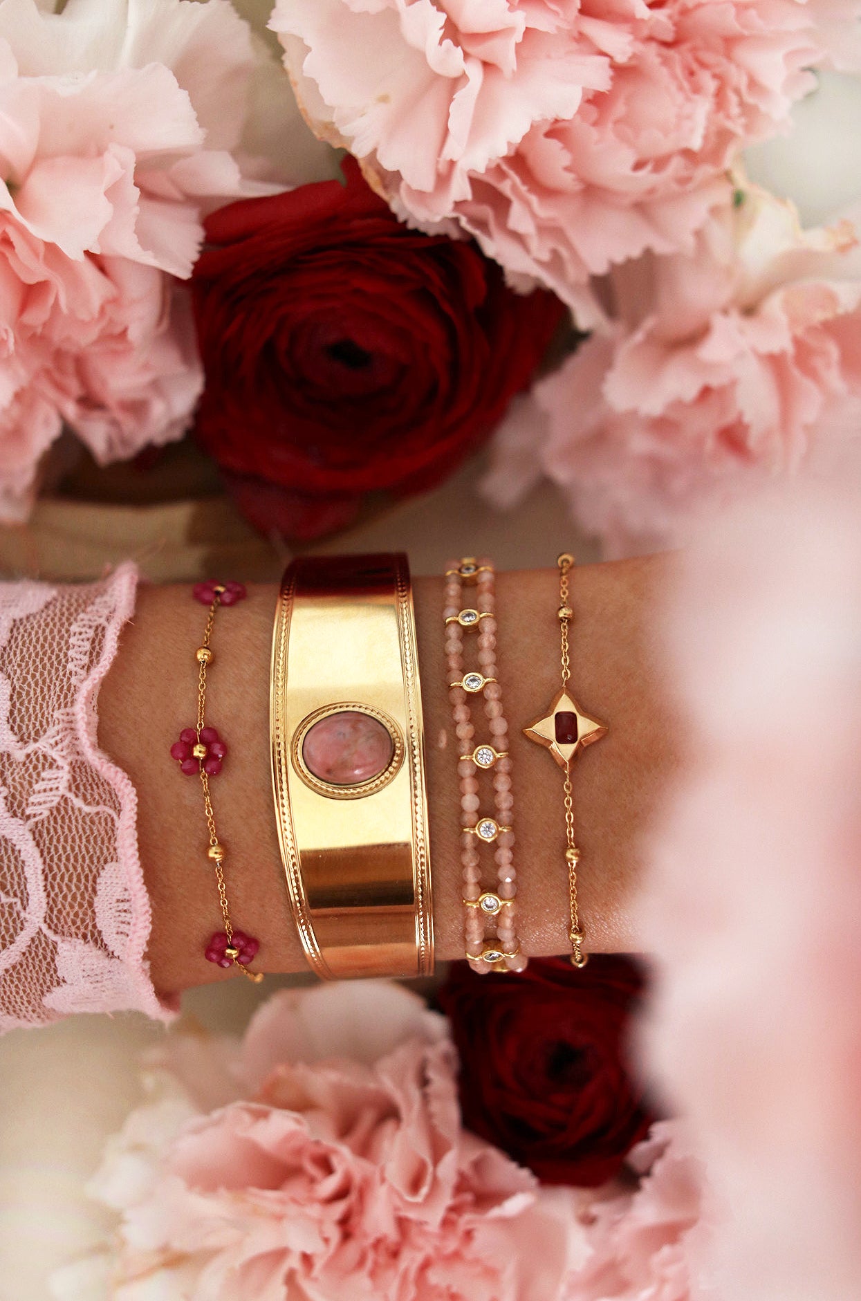 Sur la quatrième photo portée, le mannequin porte également les collier Latido et Amanecer et les bracelets Gabriel et Flor.