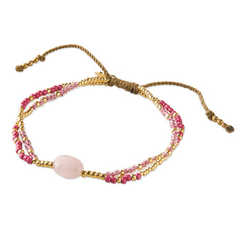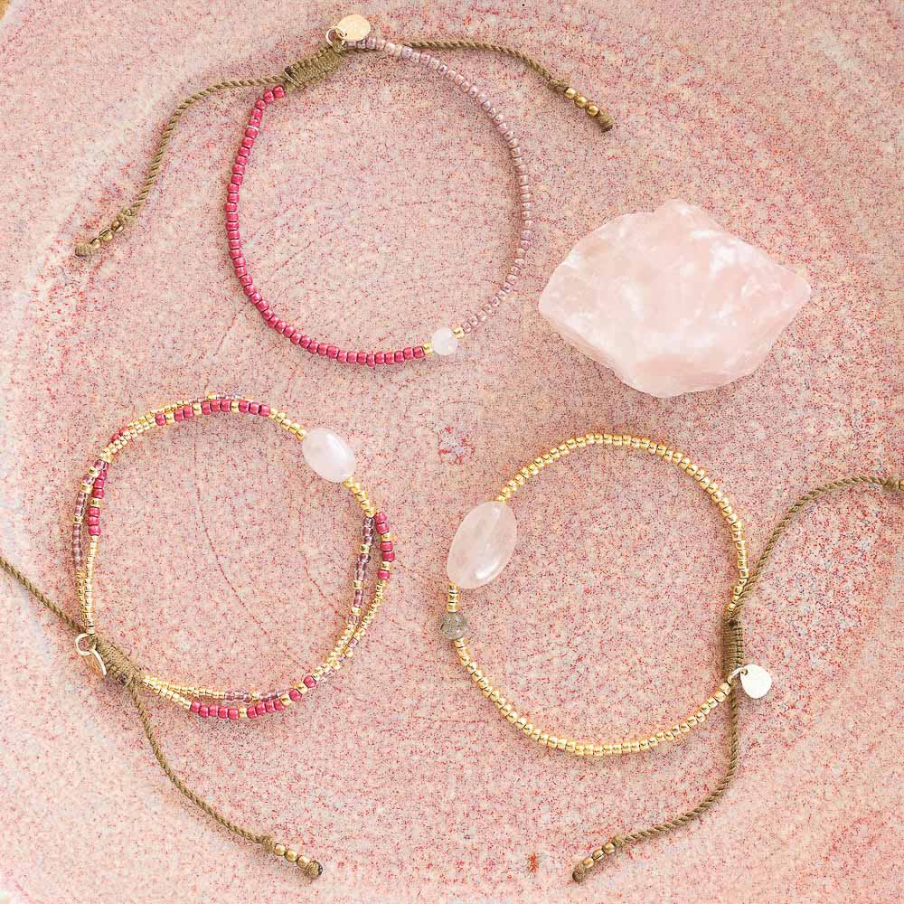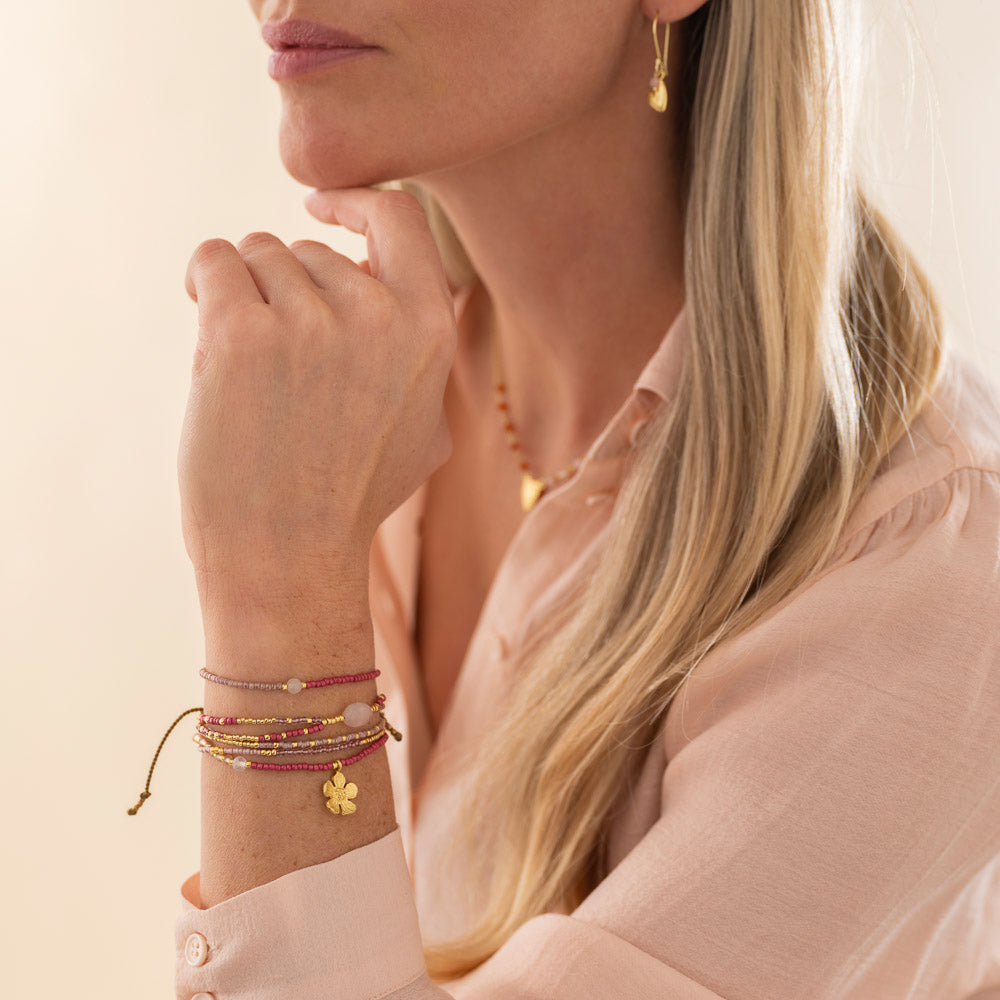 Ce bracelet Shining, fait main, met en valeur une pierre naturelle lisse au centre. Ses deux rangs de perles en verre colorées et dorées apportent une touche élégante. Grâce à son nœud coulissant ajustable, il s’adapte parfaitement à tous les poignets.