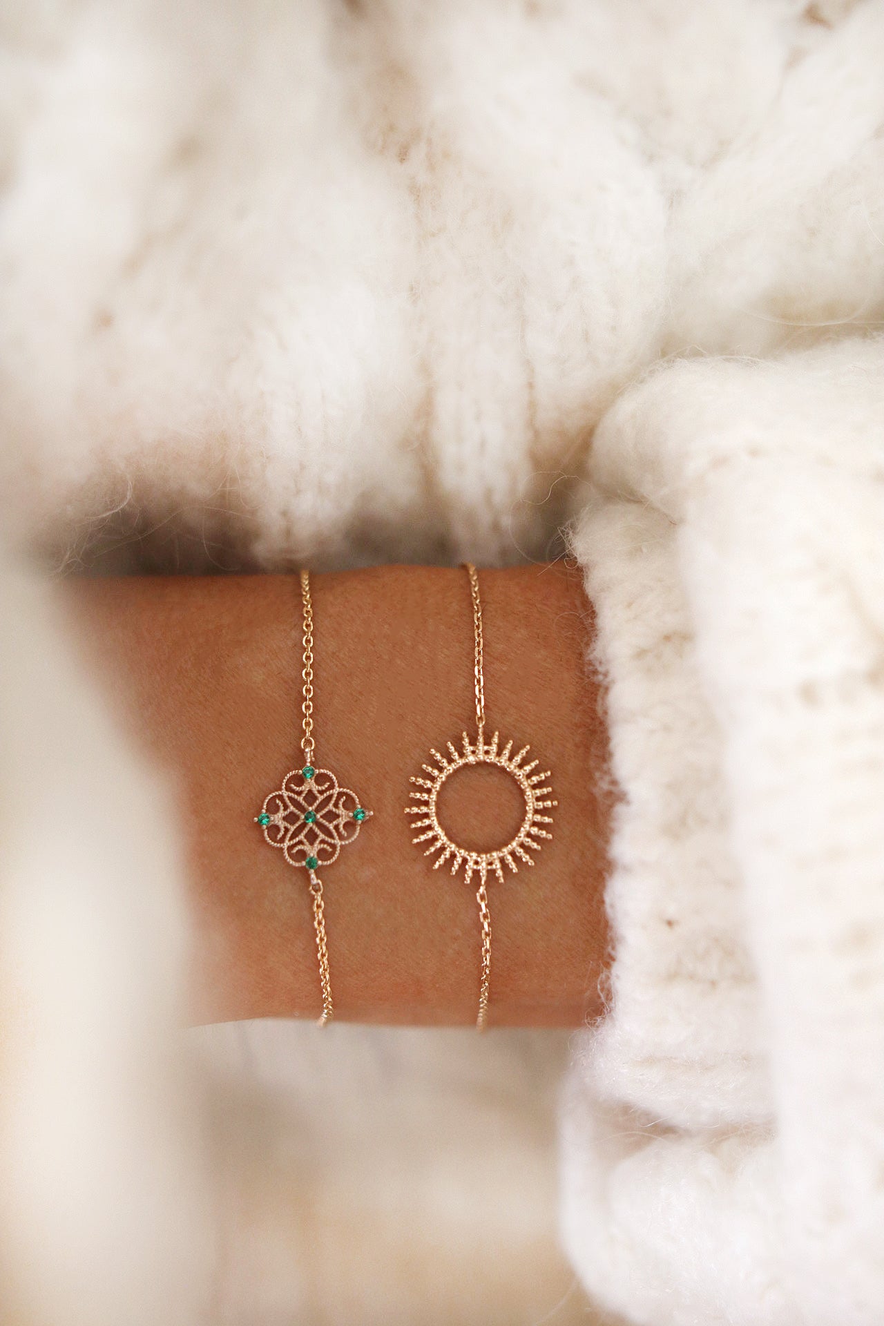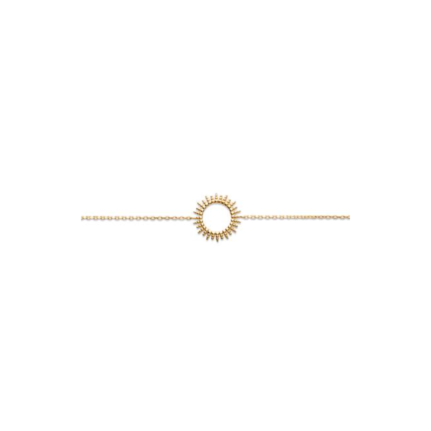 Le bracelet Soléna brille par sa finesse et son éclat solaire. Son cercle doré orné de délicats rayons évoque la chaleur et la lumière du soleil, sublimant le poignet d’une aura lumineuse et élégante.