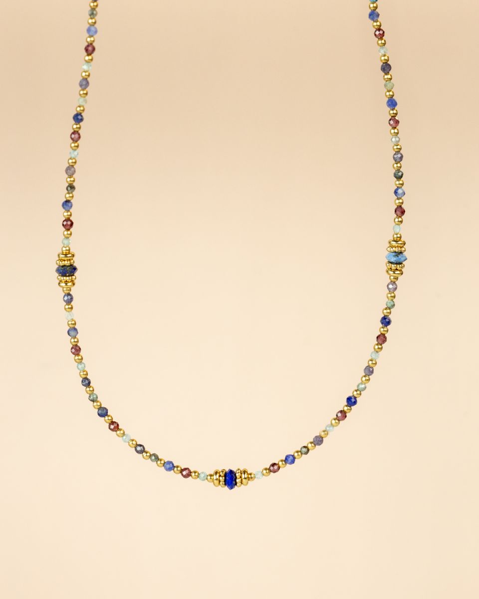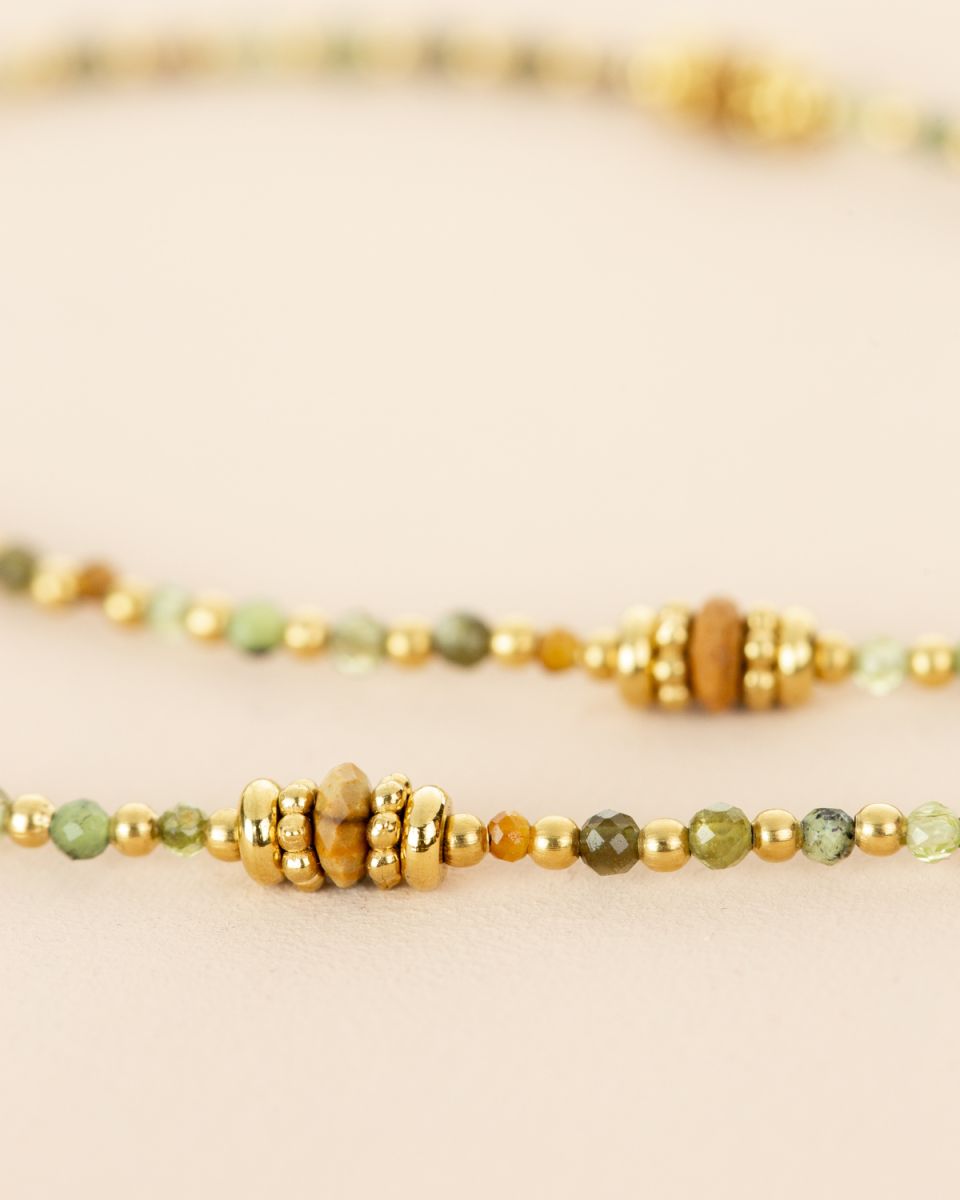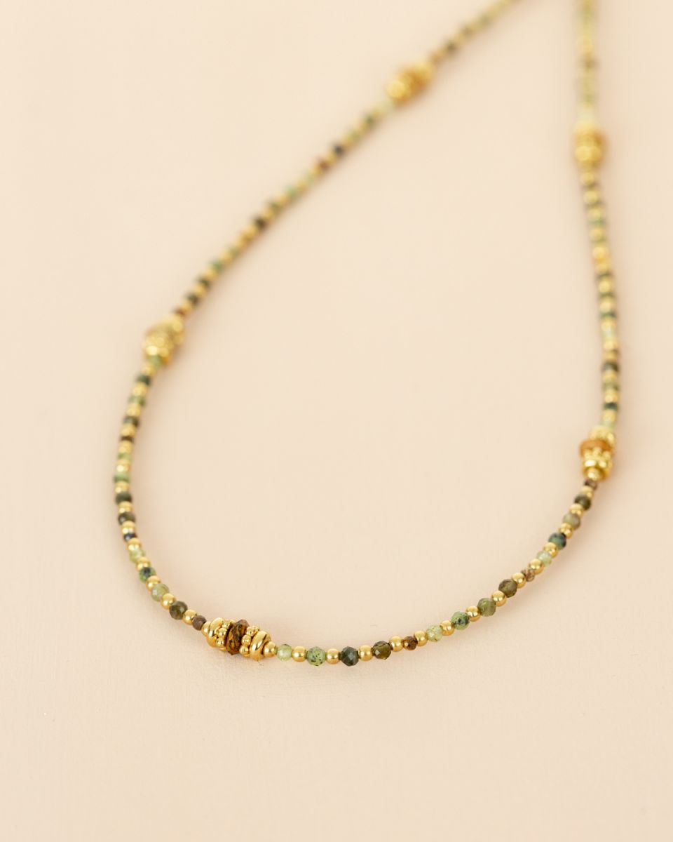 Le collier Nola séduit par sa finesse et son charme naturel. Ses perles vertes et dorées s’accordent dans une harmonie subtile, évoquant la fraîcheur de la nature et l’élégance du soleil couchant. Un bijou délicat et raffiné, parfait pour habiller votre décolleté d’une touche lumineuse et intemporelle.