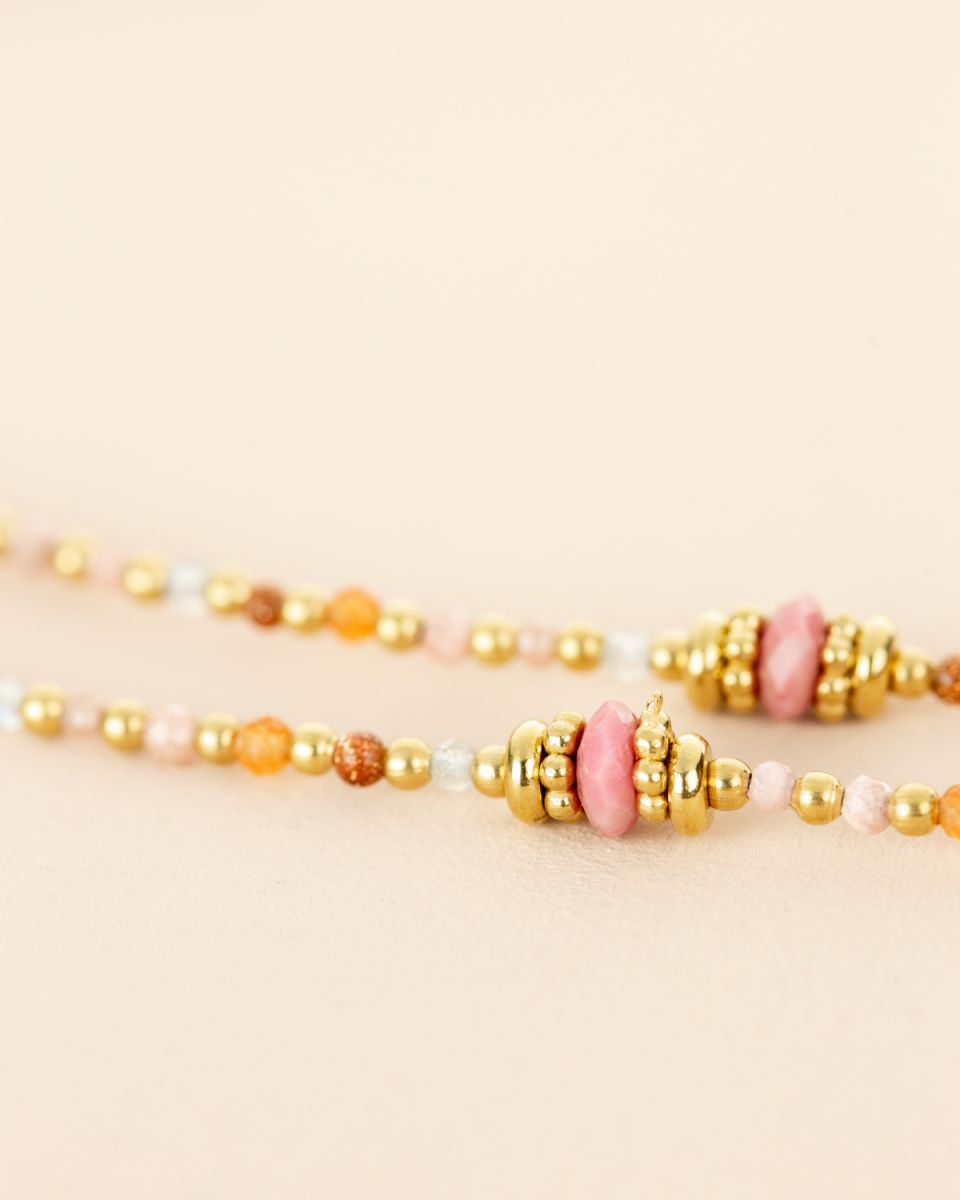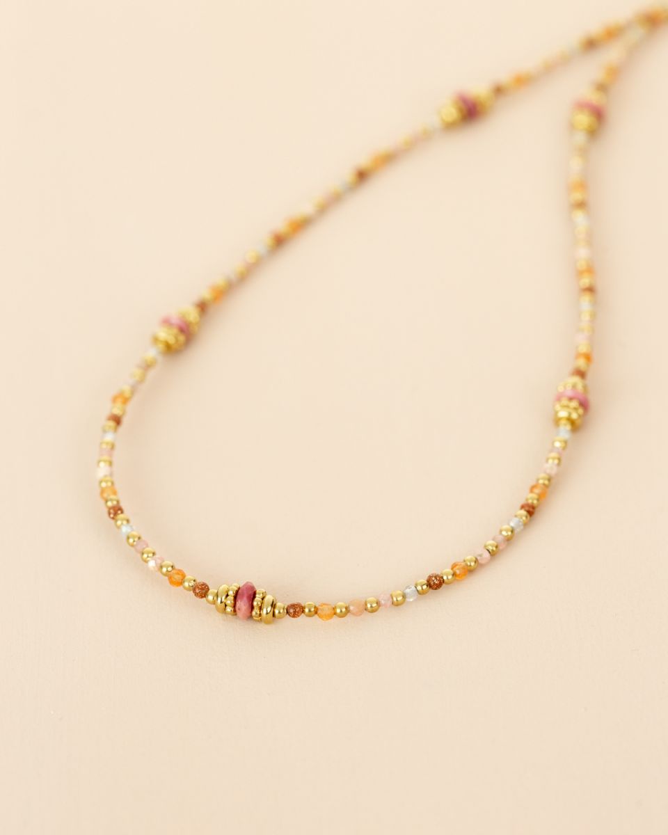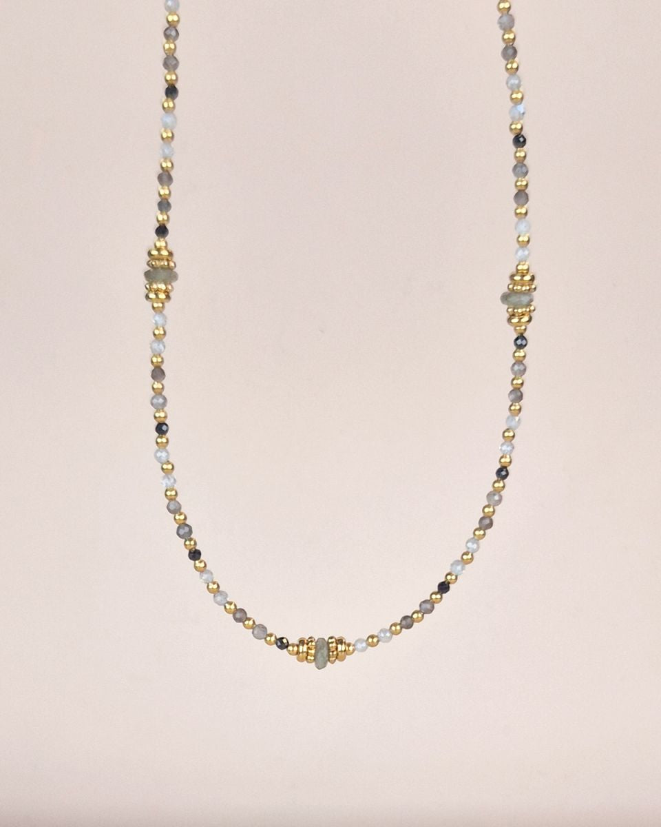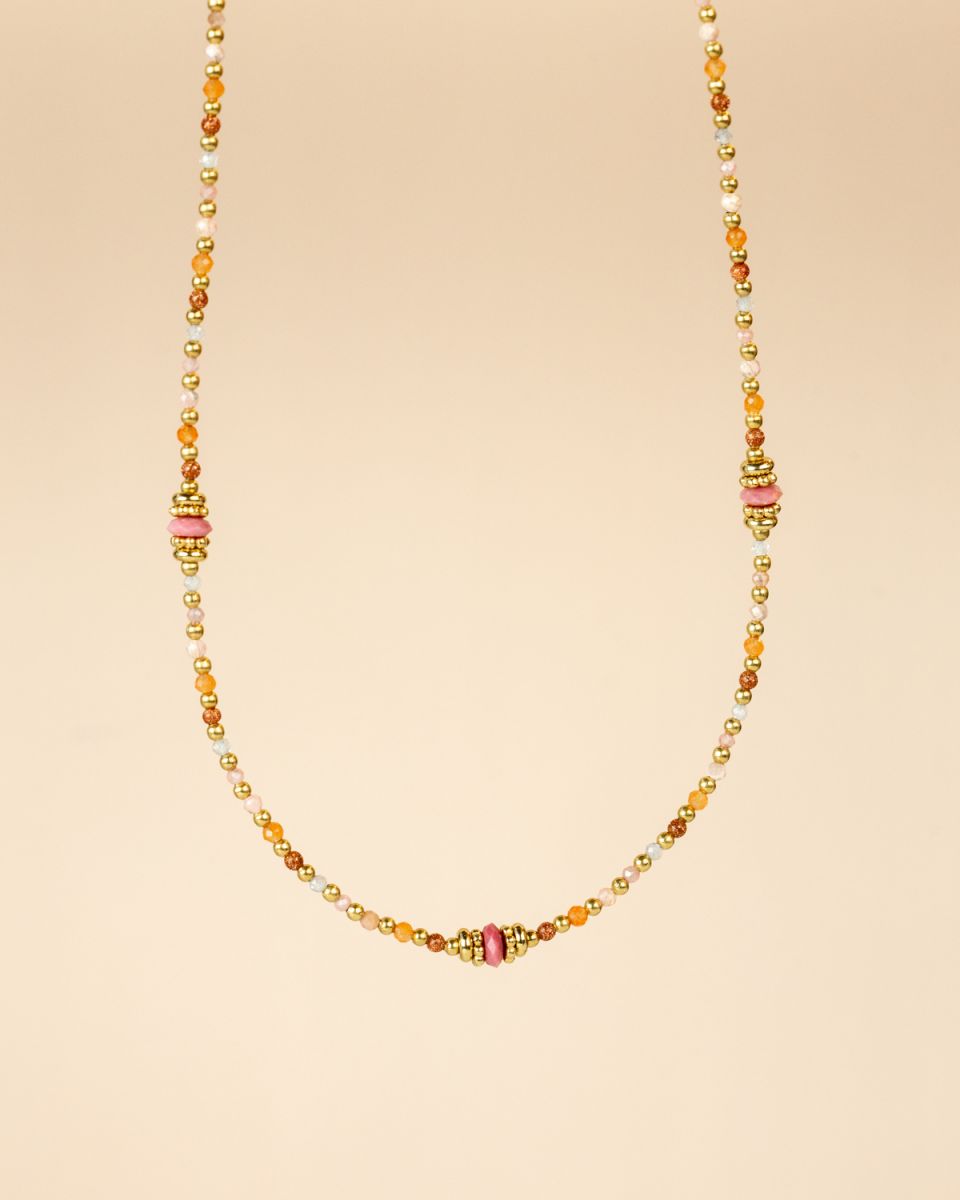 Le collier Nola séduit par sa finesse et son charme naturel. Ses perles vertes et dorées s’accordent dans une harmonie subtile, évoquant la fraîcheur de la nature et l’élégance du soleil couchant. Un bijou délicat et raffiné, parfait pour habiller votre décolleté d’une touche lumineuse et intemporelle.