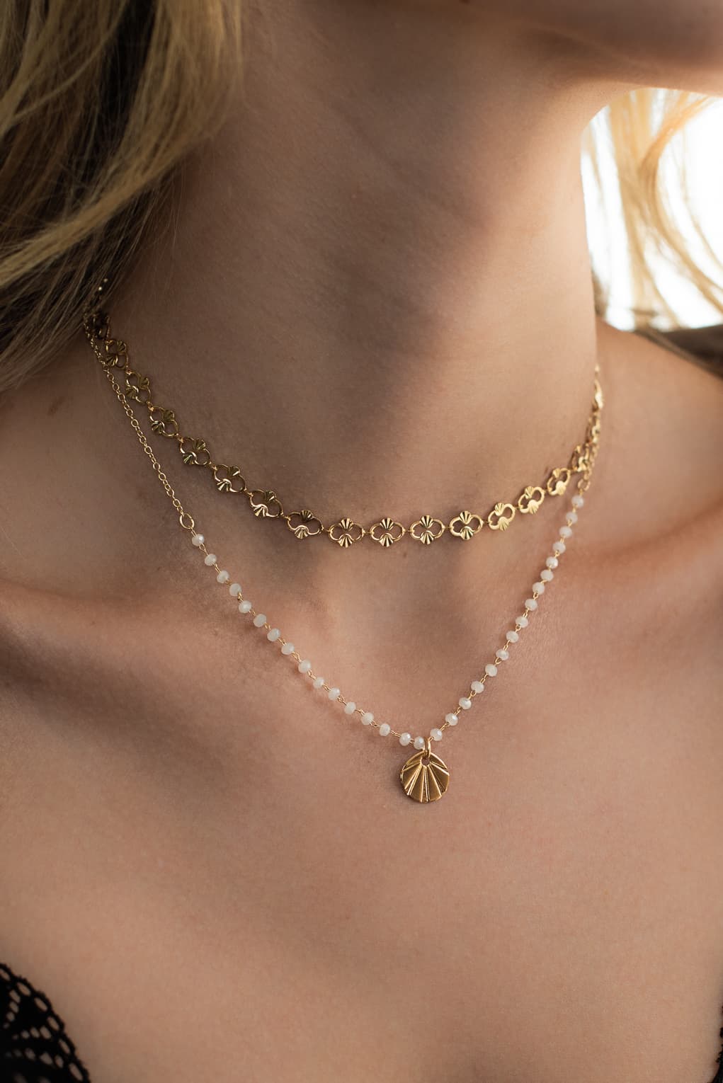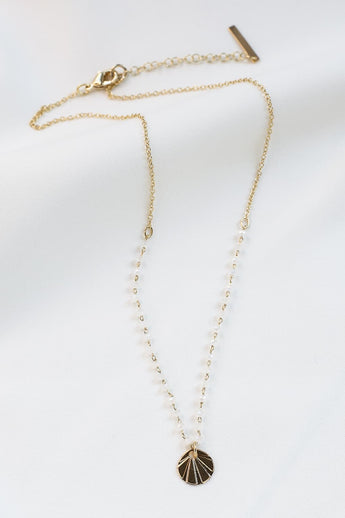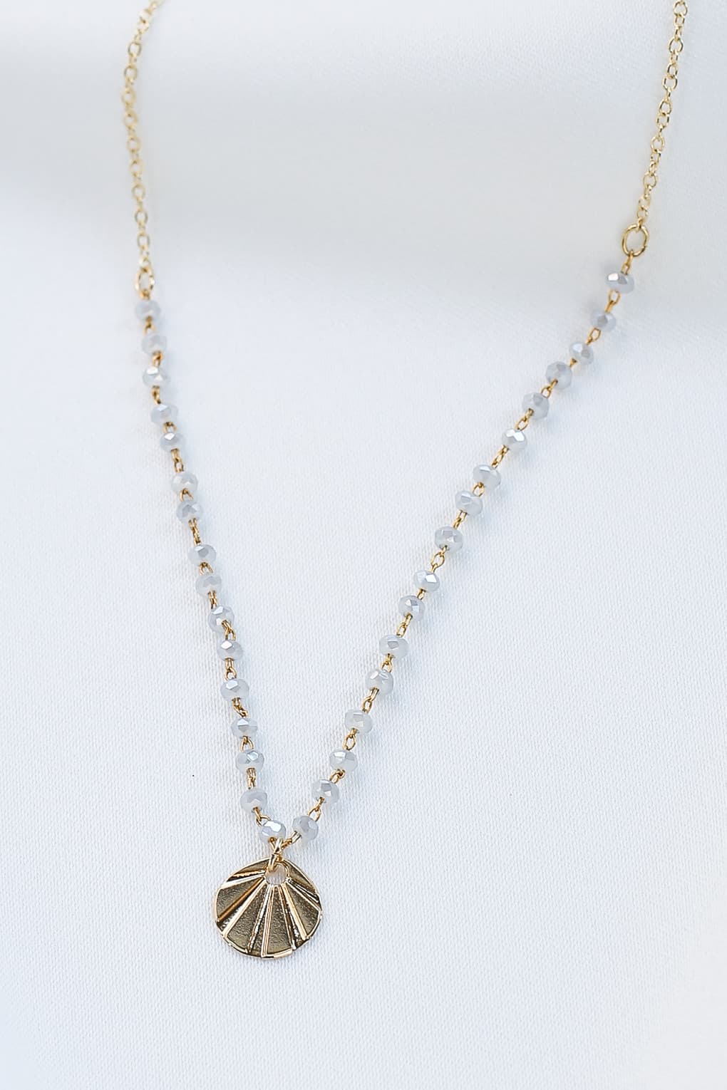 Un joli collier orné de perles de verre et d'un délicat pendentif doré.