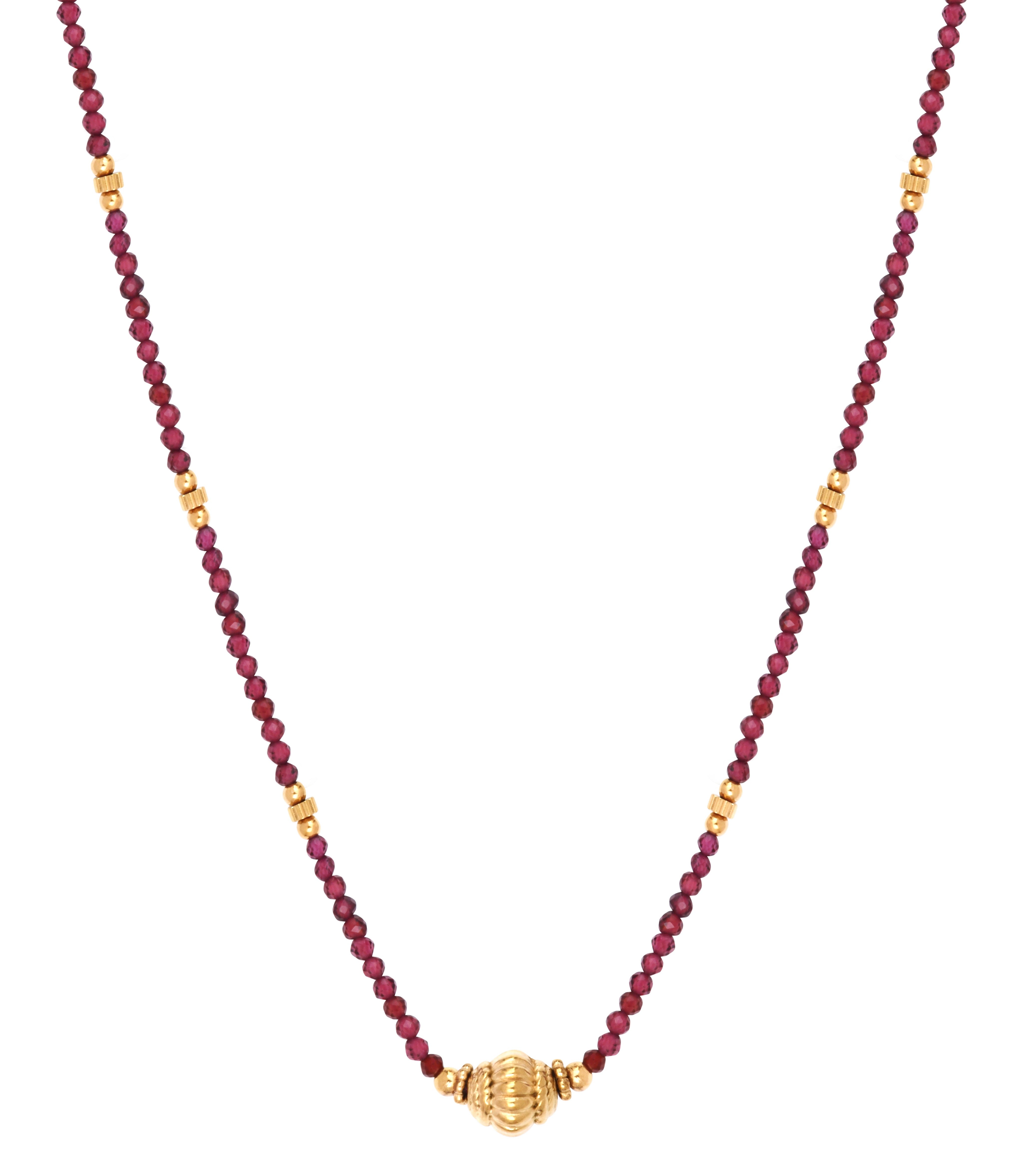 Le collier Asha se distingue par son fil de perles de grenat intenses rehaussé de détails dorés délicats. À la fois sobre et éclatant, il incarne la force et la féminité avec une touche de sophistication orientale. Son design épuré et coloré illumine le port de tête et s’associe parfaitement à d’autres bijoux dorés pour une allure élégante et solaire.