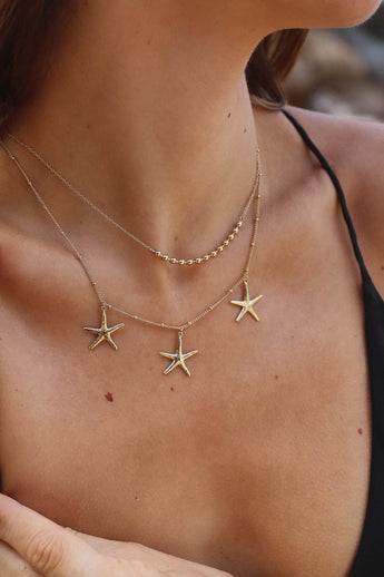 Découvrez notre collier Mattea, composé d'une simple chaîne bille et de trois pendentifs étoile de mer.