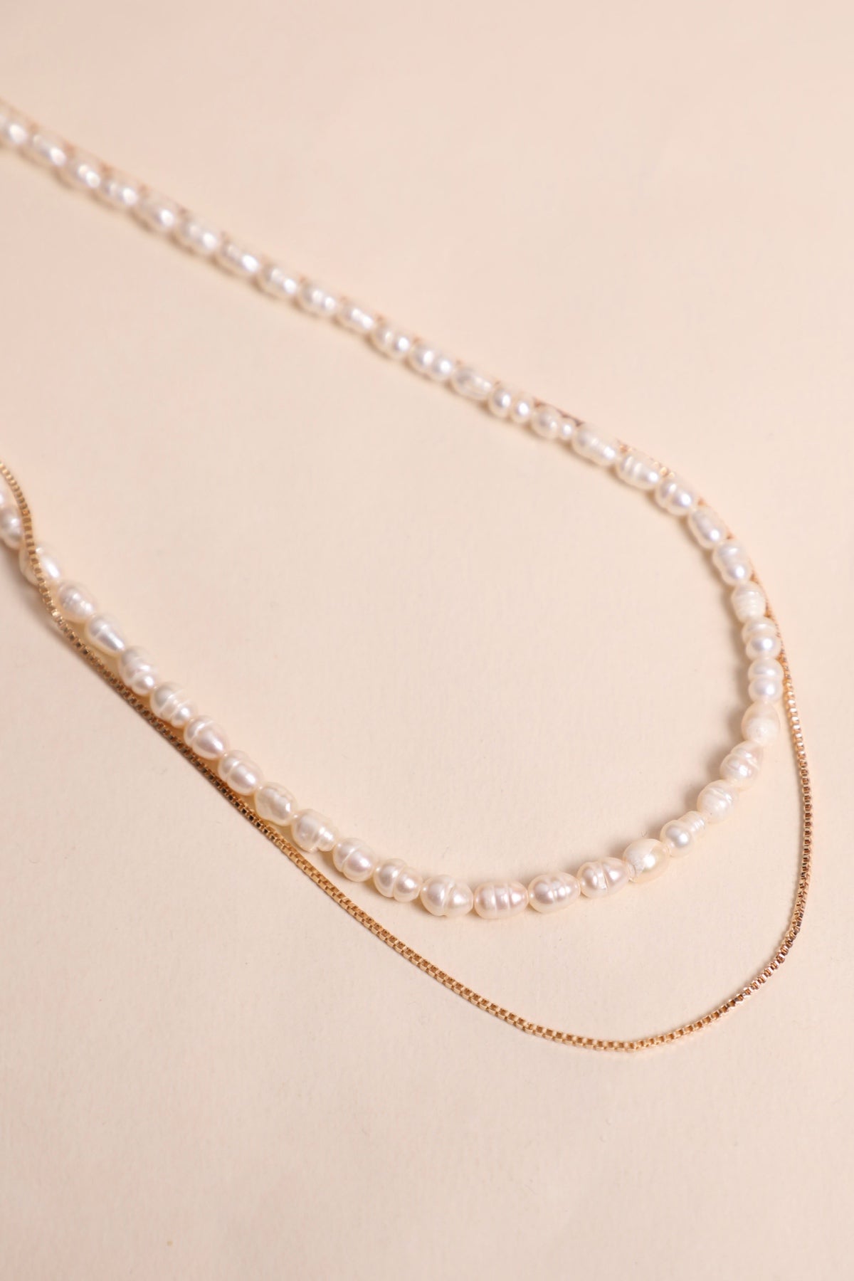 Découvrez notre collier double Neria, avec sa chaîne en perle d'eau douce et sa chaîne vénitienne dorée, parfait pour sublimer toutes les tenues.