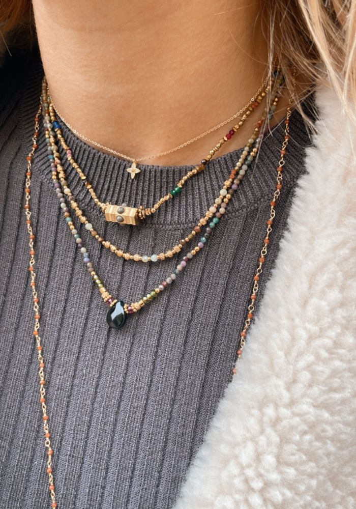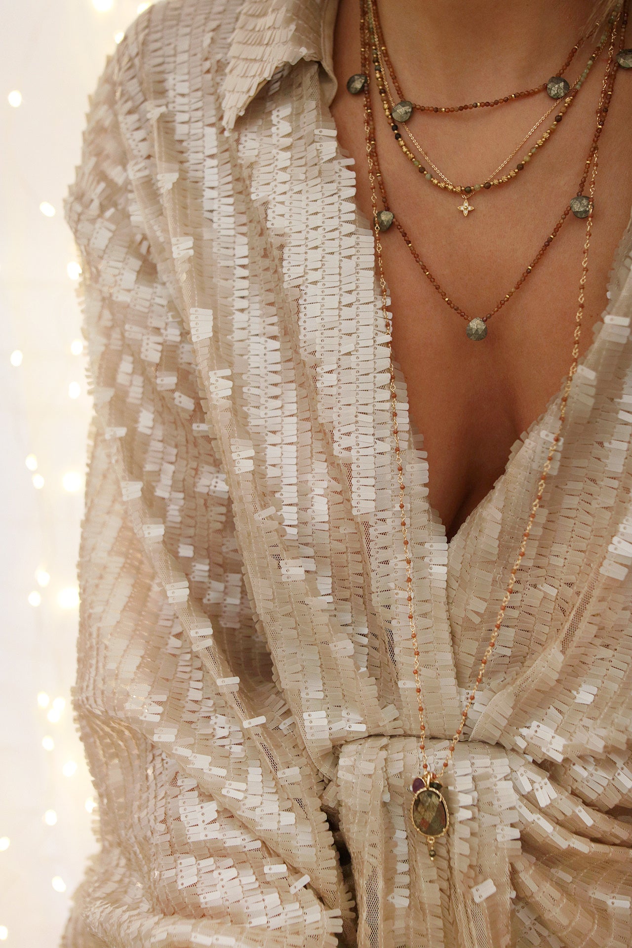 Sur la première photo portée, le mannequin porte également les sautoirs Riya et Sita.