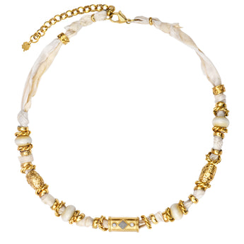 Le collier Rani Blanc séduit par son harmonie lumineuse mêlant perles claires, ruban ivoire et détails dorés sculptés. En son centre, un cylindre doré orné de cristaux discrets capte la lumière avec élégance. Son contraste doux entre le blanc nacré et l’or chaud évoque la pureté et la sérénité. Un bijou à la fois bohème et sophistiqué, parfait pour illuminer une tenue d’été ou sublimer un look minimaliste.