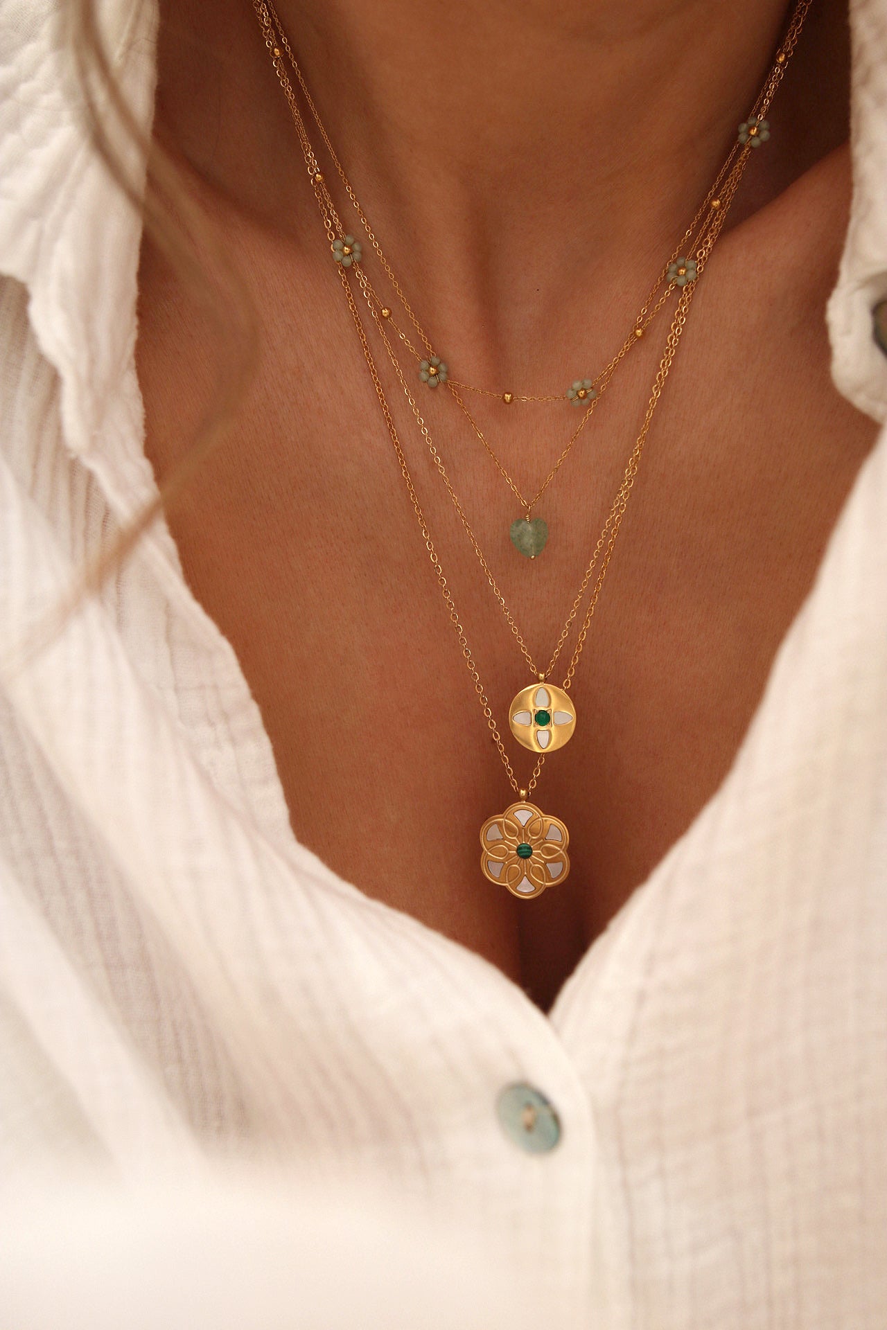 Sur la photo portée, le mannequin porte également le collier Flore vert pastel, le collier Vida et le collier Tehuana.