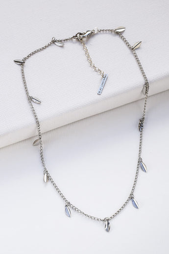 Un collier court délicat, décoré d'éléments en forme de feuille. Fabriqué à partir d'une base en laiton plaqué argent de haute qualité, selon votre choix.