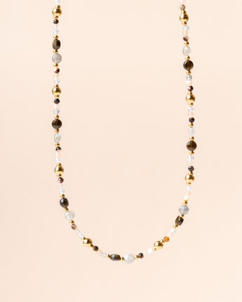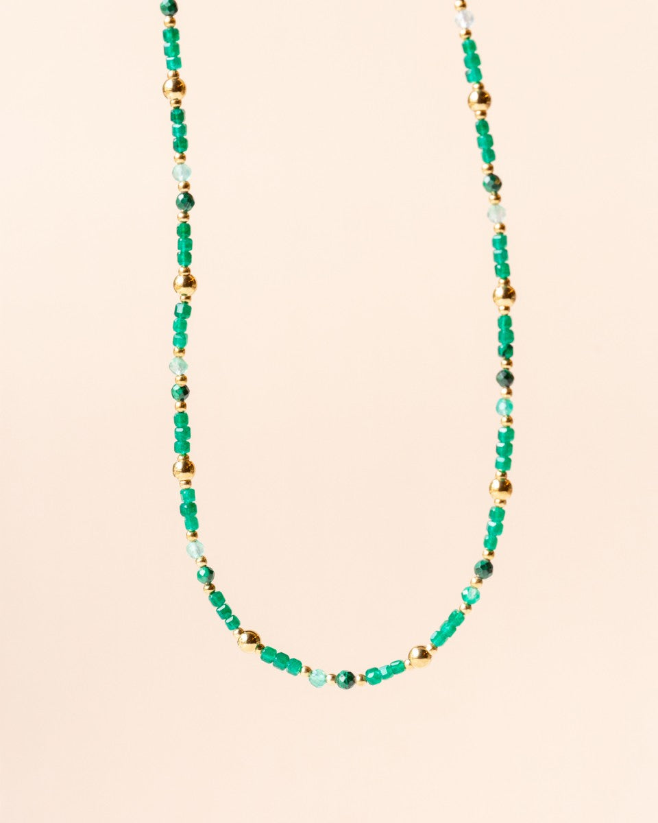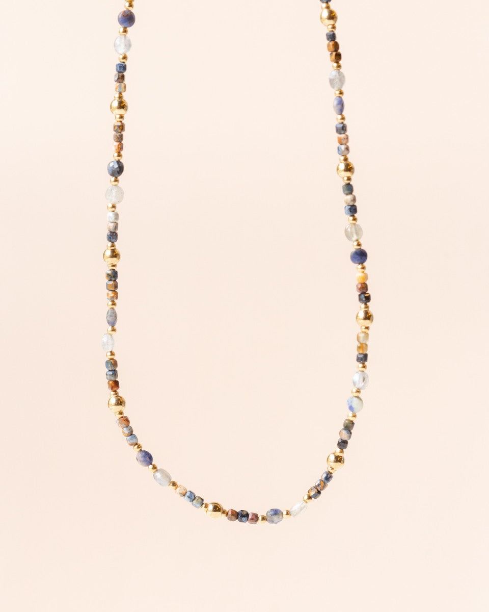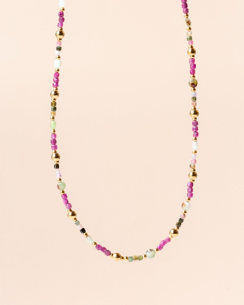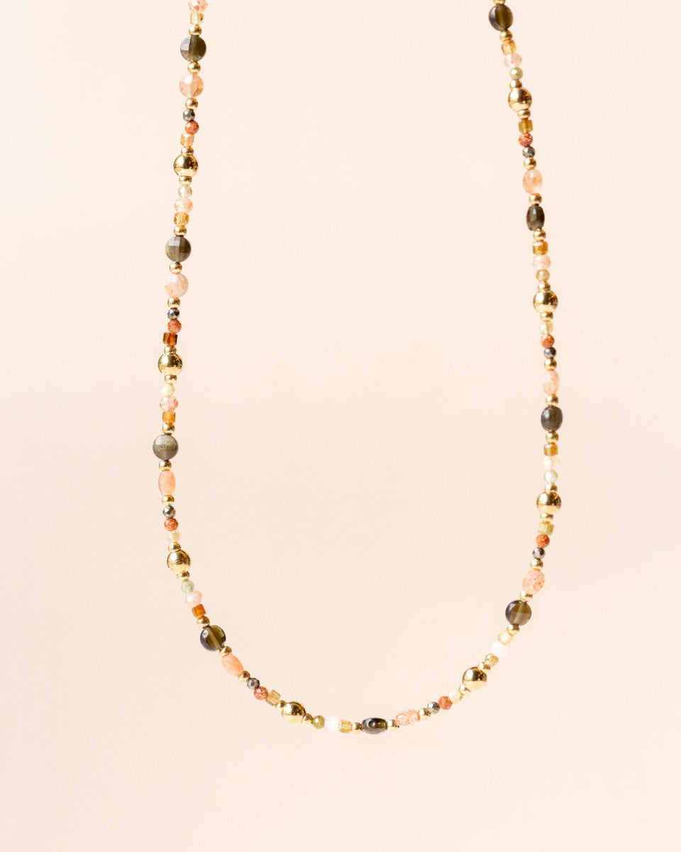 Le collier Sartje allie éclat et douceur avec ses pierres naturelles multicolores et ses perles dorées. Ses nuances lumineuses rappellent la chaleur du soleil et la beauté de la nature, pour une touche d'élégance bohème au quotidien.