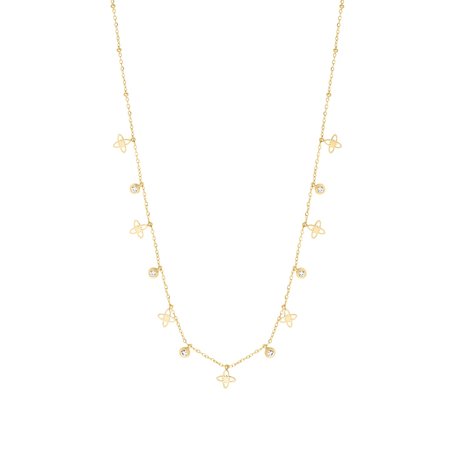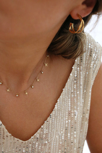 Le collier Stella se pare de fines fleurs ajourées ponctuées de zircons scintillants. Sa composition gracieuse mêle féminité et éclat subtil, illuminant le décolleté avec délicatesse. Un bijou intemporel, pensé pour accompagner avec élégance aussi bien les instants du quotidien que les occasions les plus précieuses.