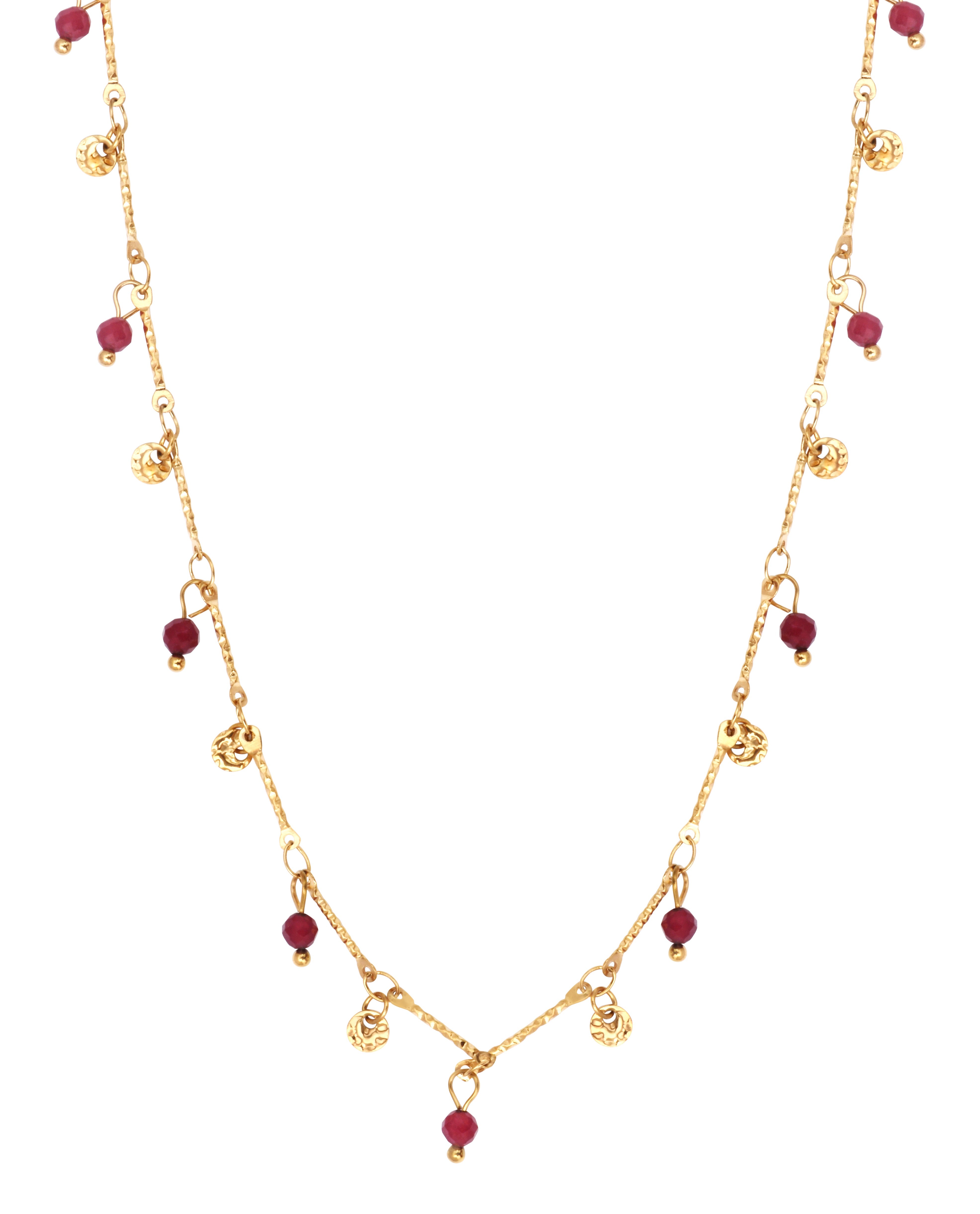 Le collier Talia séduit par sa chaîne fine dorée ornée de petites pampilles martelées et de pierres de grenat. Tout en délicatesse, il reflète la passion et l’élégance intemporelle. Sa brillance dorée associée à la chaleur du rouge en fait un bijou à la fois raffiné et solaire, idéal pour sublimer le port de tête avec une touche d’éclat discret.