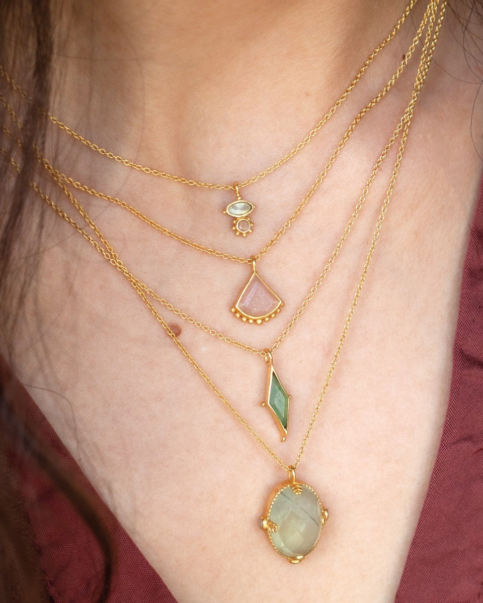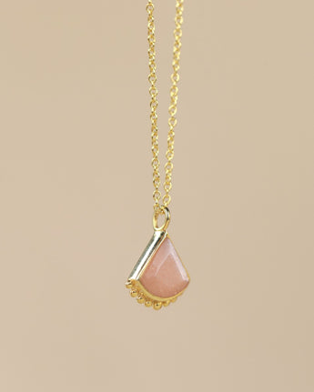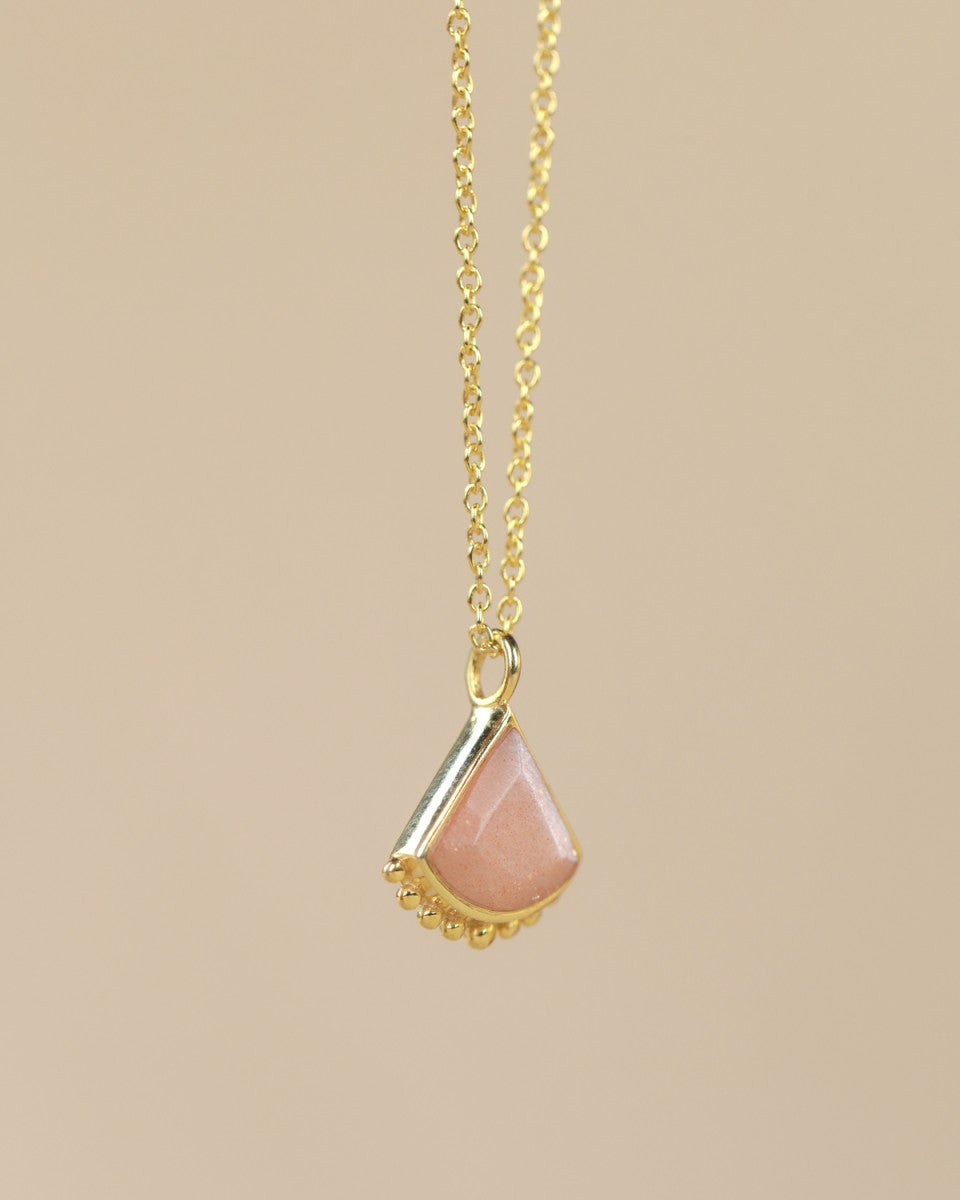 Le collier Zulu séduit par sa douceur et sa modernité. Son pendentif en demi-lune, serti d’une pierre rosée délicate, évoque la féminité et l’équilibre. Chaque détail doré, finement perlé, sublime la lumière et apporte une touche solaire à ce bijou tout en subtilité. Inspiré des formes organiques, il incarne la beauté naturelle et la sérénité d’un style à la fois tendre et affirmé.