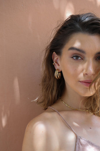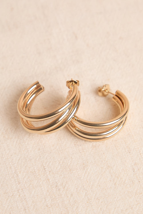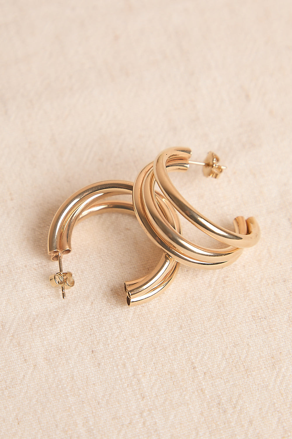 Ces boucles d’oreilles dorées jouent les volumes avec trois anneaux entrelacés. Un modèle intemporel au twist moderne, à porter du matin au soir.