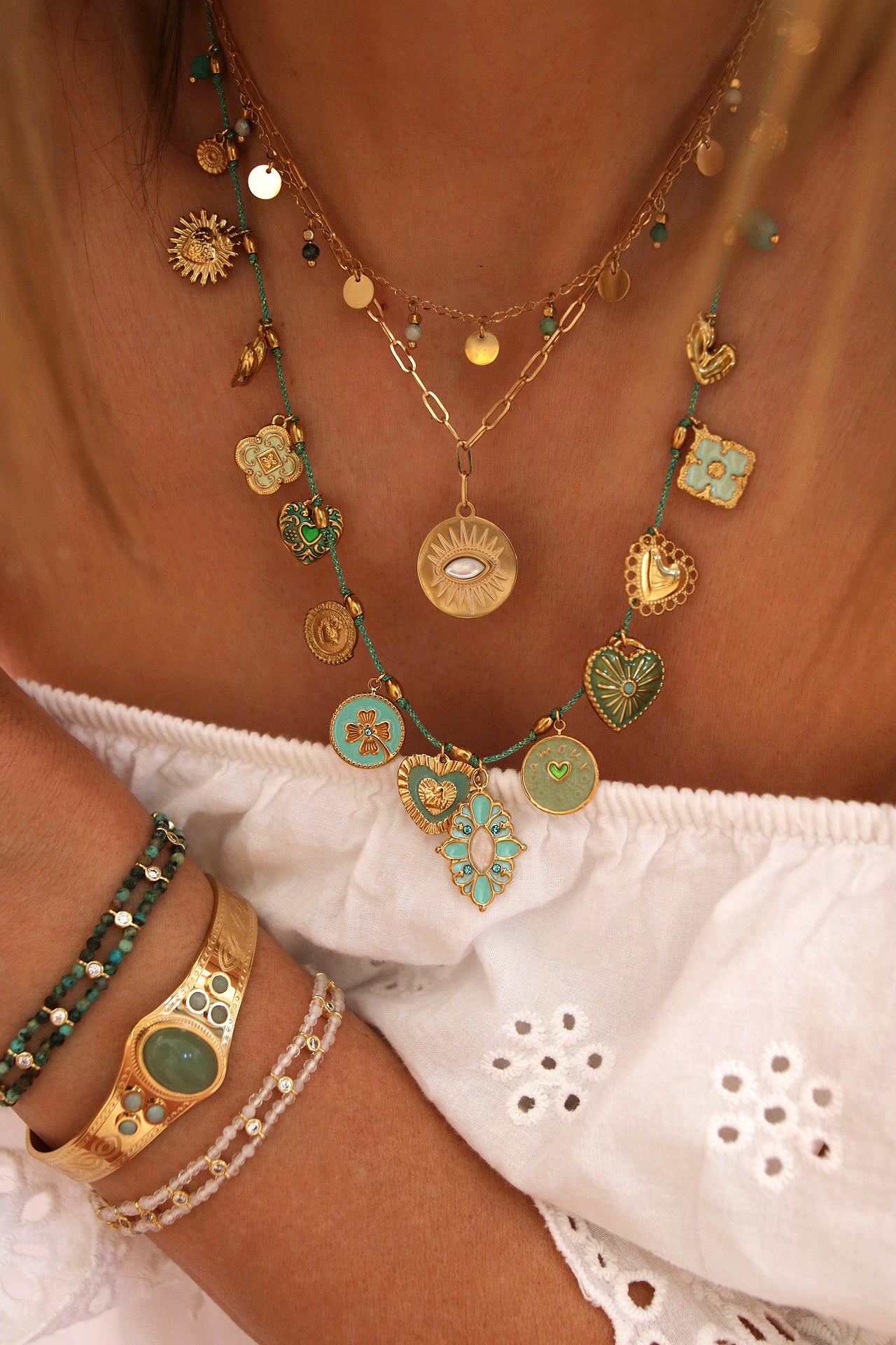 Sur la photo portée, le mannequin porte également les bracelets Raices, le collier Acapulco, le collier Milagros et le collier Arte.